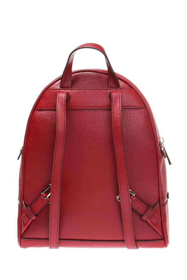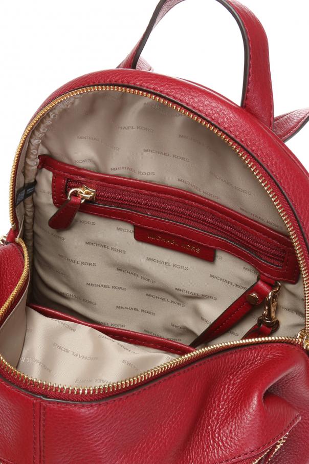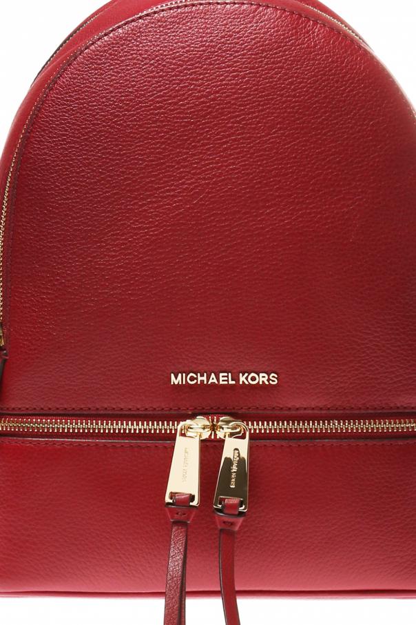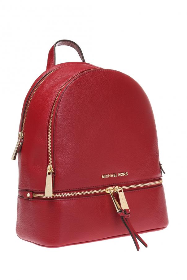 Burgundy backpack, 'RHEA ZIP' from Michael Michael Kors. Made of leather with a special texture. Fastened with a zip. On the front a metal logo and two zippered pockets. Half-round handle. Braces with the possibility to adjust length. Beige inner layer. Inside a compartment, five inset pockets, one zippered pocket and a short detachable belt including a snap hook. Metal finish in gold.