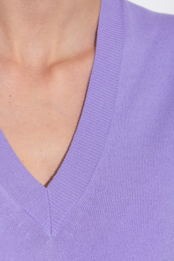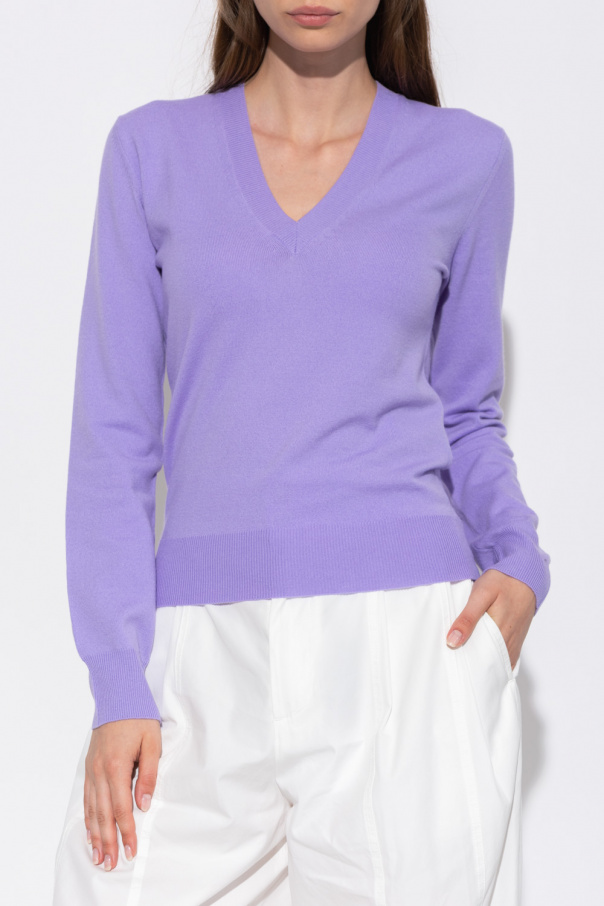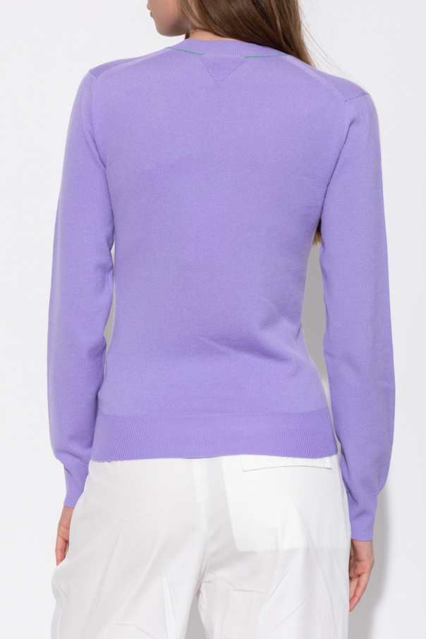 Light purple V-neck sweater from Bottega Veneta. Made from wool with a regular fit, this style features long sleeves and ribbed details on the collar, bottom hem and cuffs.