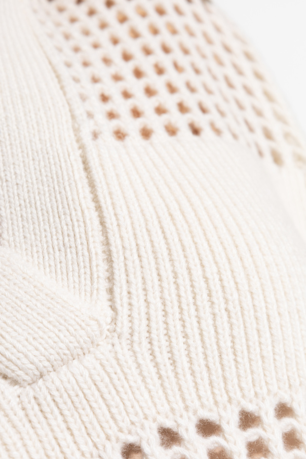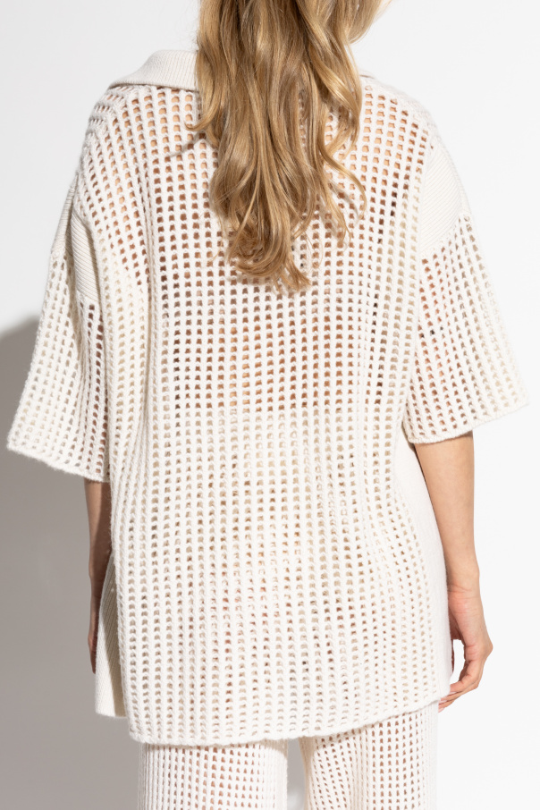 Introducing the \"Polo`Lei`\" by Lisa Yang, a true emblem of sartorial elegance tailored for the connoisseur of high-end fashion. Crafted from 100% cashmere, this cream-colored polo shirt is the pinnacle of luxury and comfort. Its short sleeves and V-neck collar, accented with a tasteful button closure, encapsulate the timeless polo style with a modern twist. The unique allure of the \"Polo`Lei`\" lies in its exquisite perforated pattern, creating an intricate lattice-like texture that is both visually captivating and breathable. This high-quality knitwear, devoid of any overt branding or logos, speaks volumes of its understated elegance and the brand\'s subtle approach to luxury fashion. Designed to drape gracefully to the waist or slightly longer, the \"Polo`Lei`\" offers a flattering silhouette that complements its wearer. The softness and elasticity of the cashmere blend ensure a comfortable fit that moves with you, making it an ideal choice for those who value both style and comfort. Why Choose the \"Polo`Lei`\"? Luxurious Material: 100% cashmere offers unrivaled softness and comfort. Unique Design: The perforated pattern adds breathability and an elegant visual appeal. Timeless Style: Classic polo elements with a modern twist ensure versatility and enduring appeal. Subtle Elegance: Free of conspicuous branding, it embodies the essence of minimalist luxury.