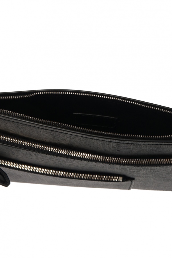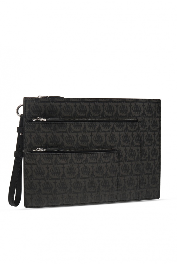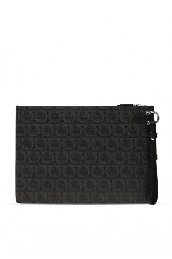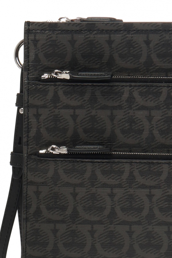 Black document case from Salvatore Ferragamo. This calf leather-crafted item is distinguished by a grey Gancini print, silver-tone metal hardware, three internal compartments with zip closure and an adjustable shoulder strap included.