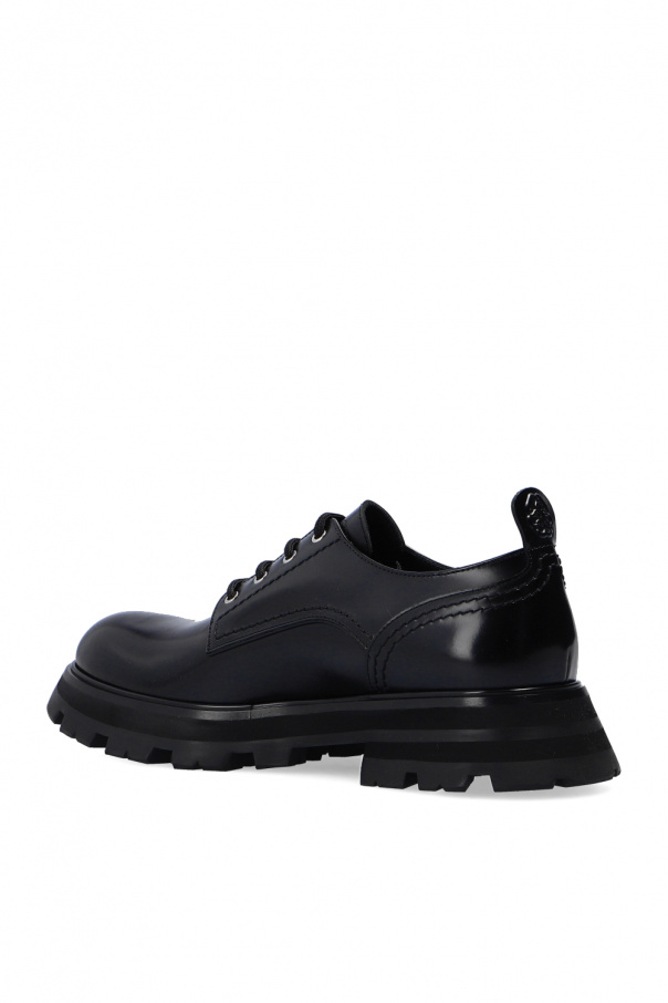 Black lace-up boots from Alexander McQueen. Crafted from leather, this design features an embossed logo and a black rubber sole.