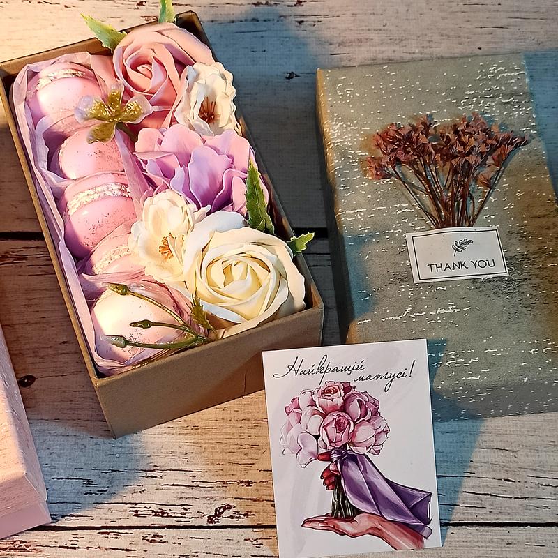 - открыткаНабор может быть сложен по вашим пожеланиям. Цвет, аромат, тематическая открытка.