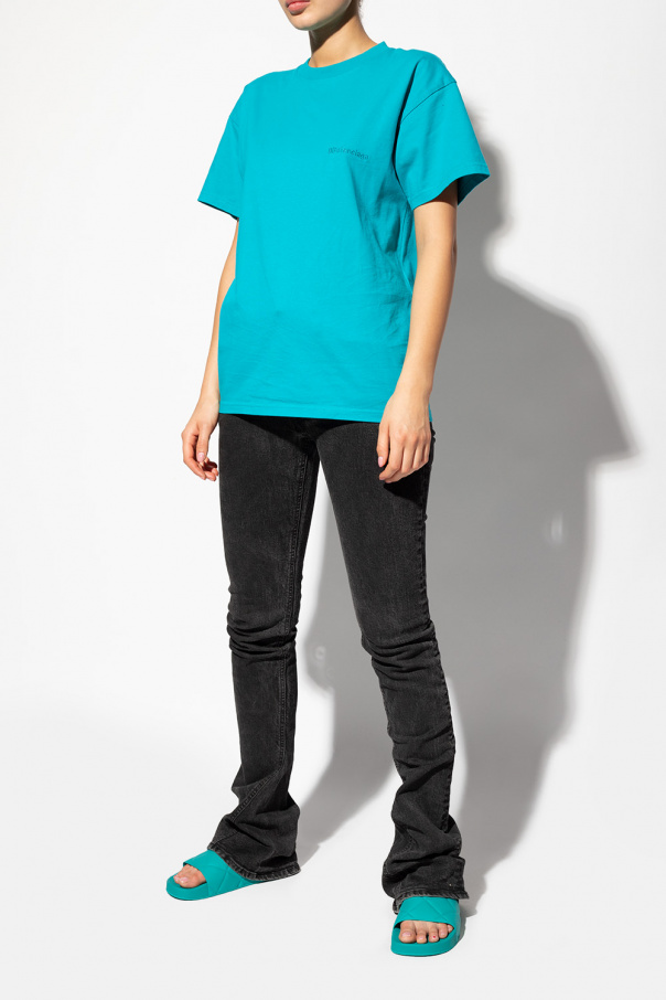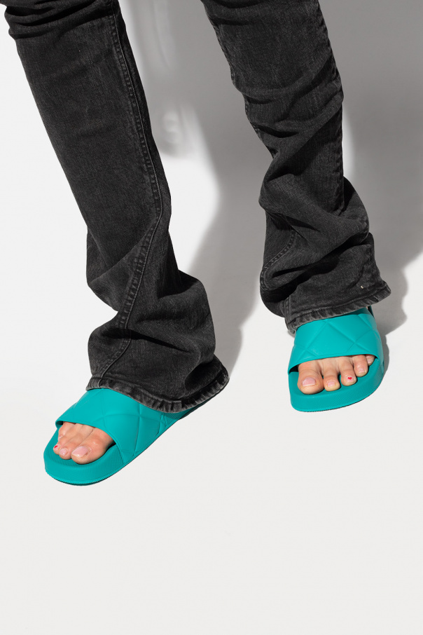Green-blue slides from Bottega Veneta. Made of rubber, this design is enriched by the label’s signature Intrecciato motif.