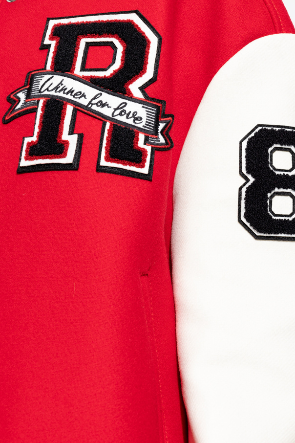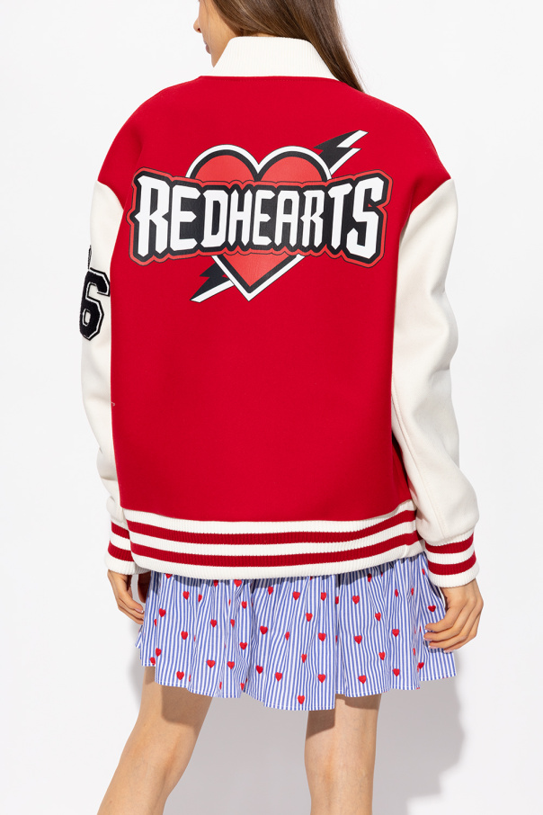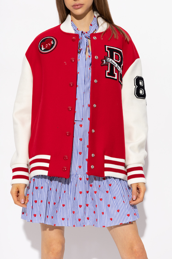 Red and white bomber jacket from Red Valentino. Made of wool and spruced up with glossy appliqués, this style features snap fastenings, a graphic print, colourful patches, two frontal pockets, long sleeves and ribbed trims on the edges.
