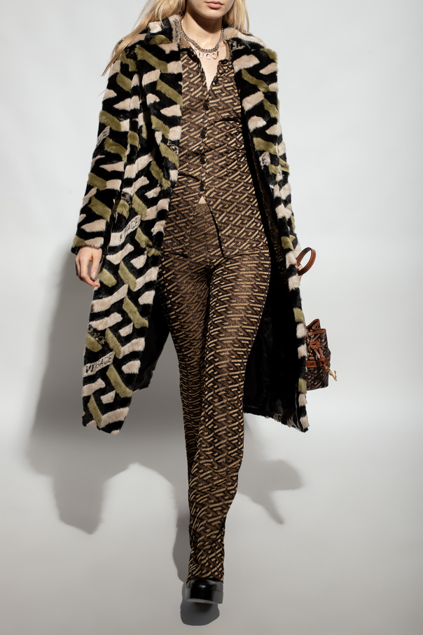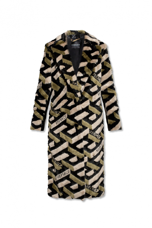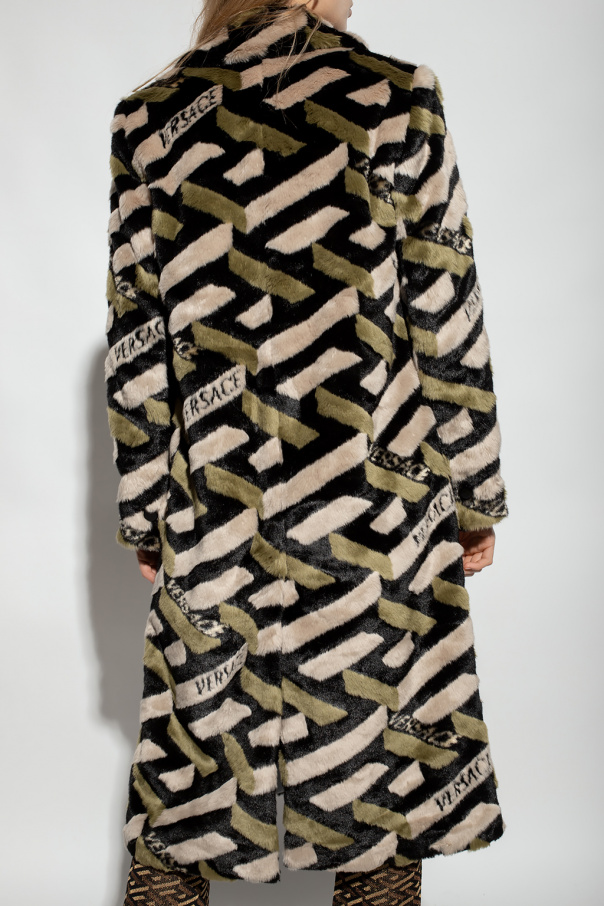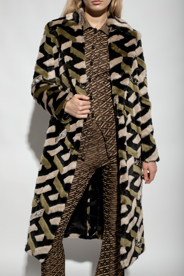 Black, green and beige coat from Versace. Crafted from faux fur, this garment features button fastenings, a logo pattern, two slip pockets, notch lapels, decorative black inserts, long sleeves and a rear vent.