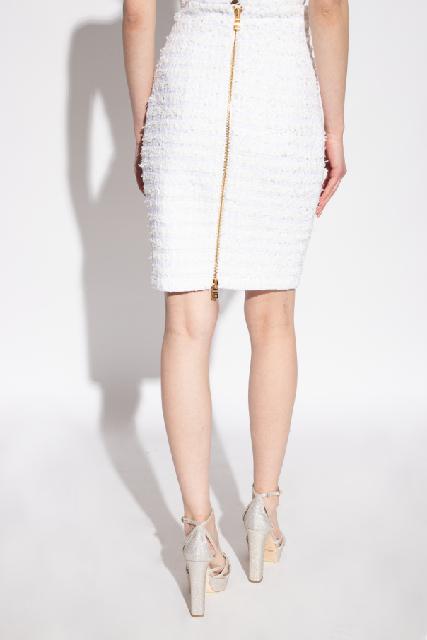 White tweed skirt from Balmain. Featuring decorative buttons with an engraved lion, this style is complete with a back zipper and glossy, silver-tone details.