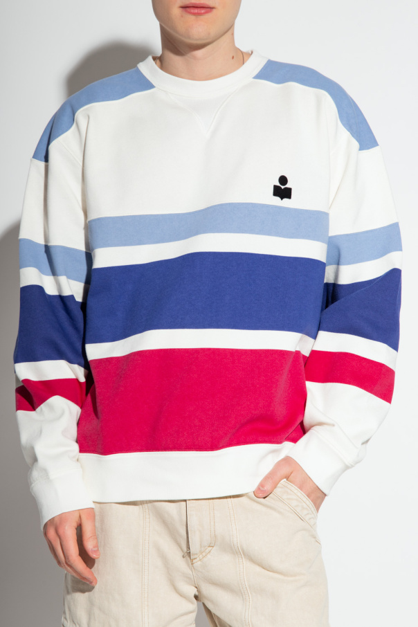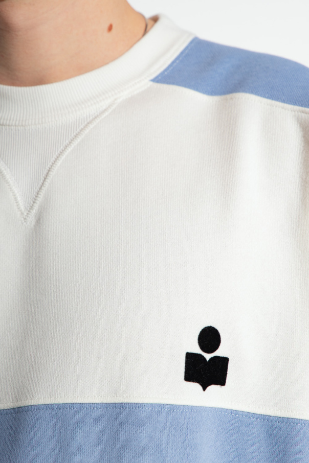 White, blue and pink ‘Meyoan’ crewneck sweatshirt from MARANT. Made of cotton, this long sleeve design features a black logo pattern with a velvet finish and ribbed edges.