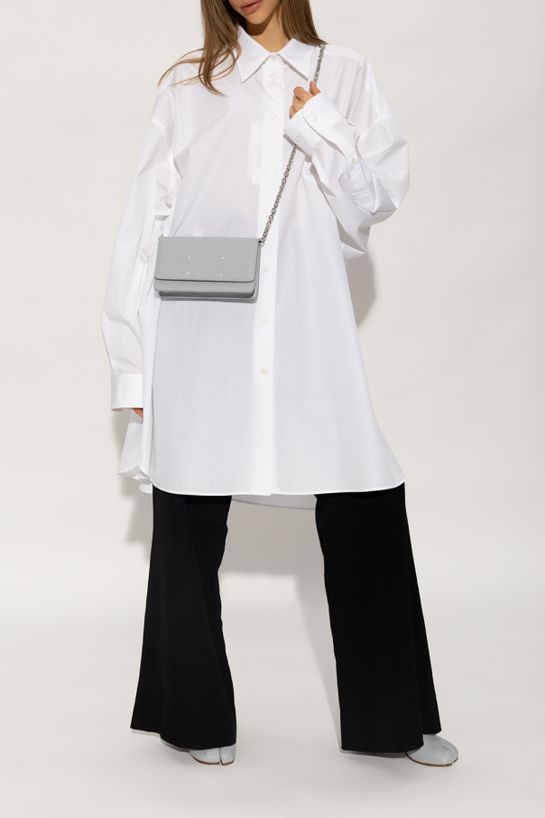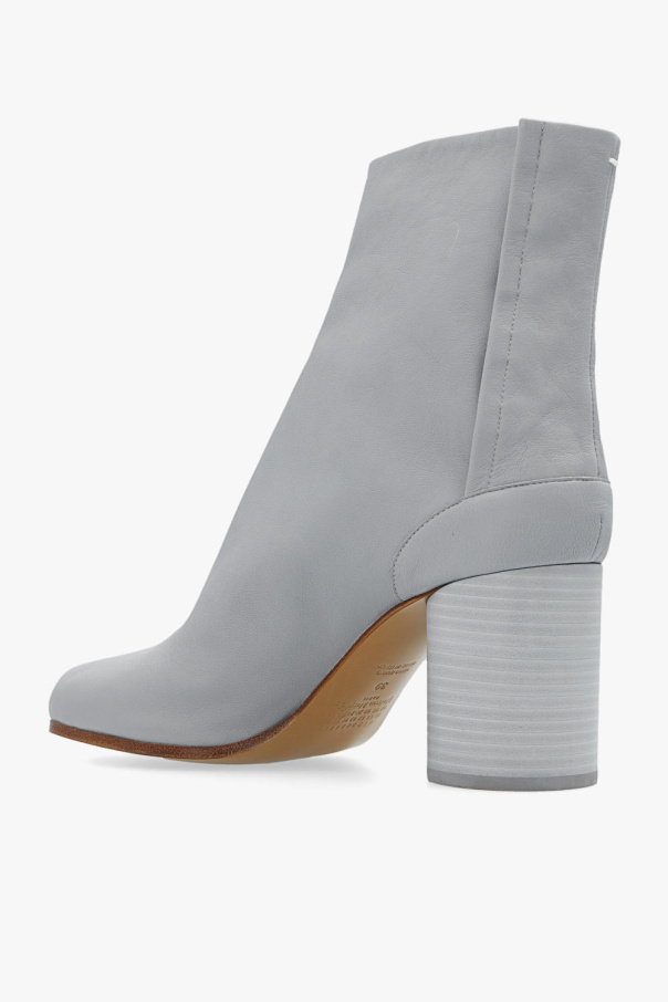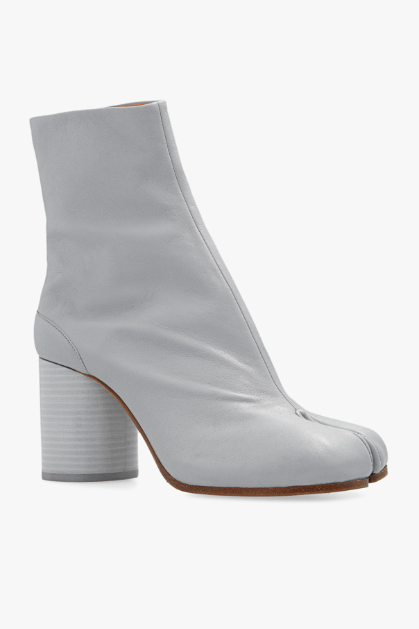 Grey heeled ankle boots from Maison Margiela. Crafted from leather with the brand\'s signature ‘Tabi’ split-toed design, this model features hidden hook closures, a cylindrical high heel and a beige leather sole.