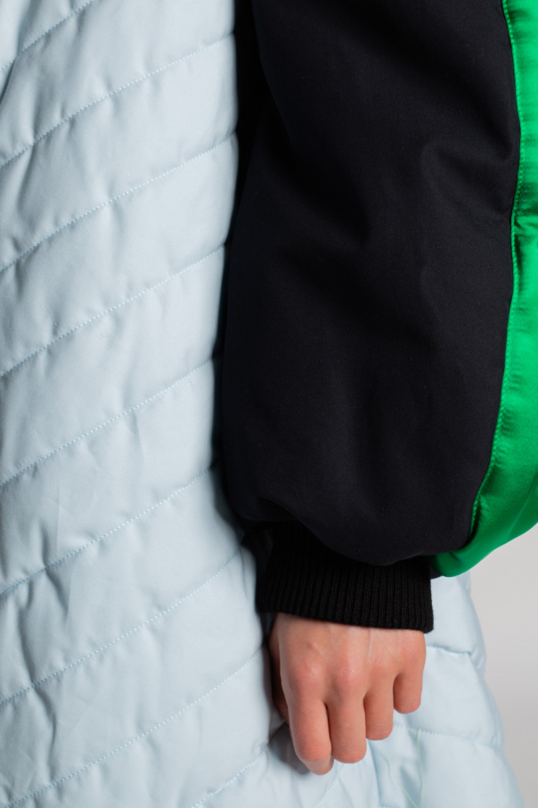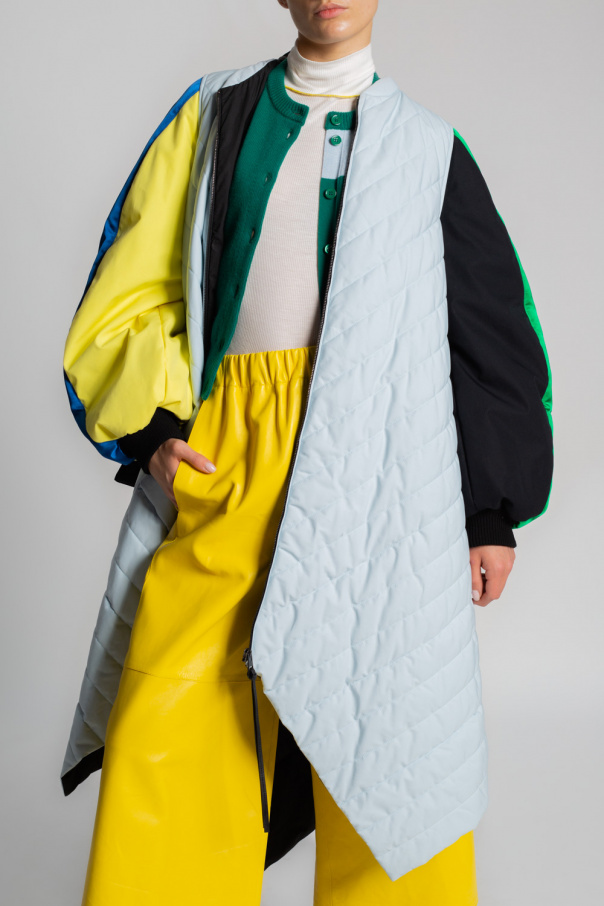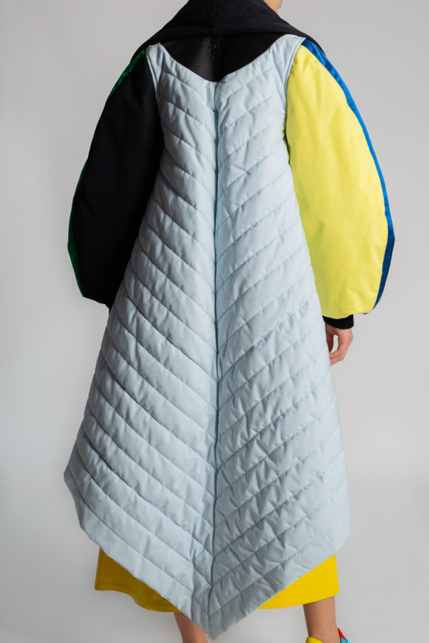 Multicoloured quilted coat from Loewe. Crafted from cotton with an asymmetrical hem, this style features a zip fastening, distinctive stitching, two slip pockets, a detachable scarf, an embossed black logo on the back and long sleeves with elasticated cuffs.