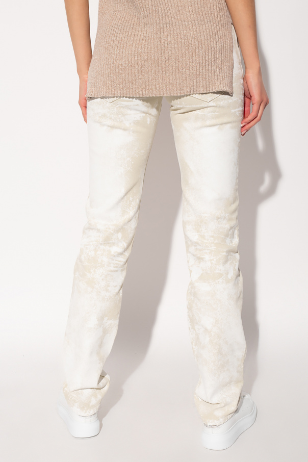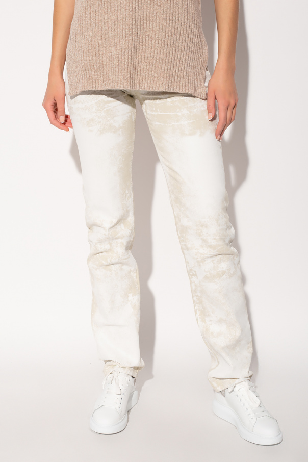 Cream and white jeans from 1017 ALYX 9SM. Cut with a high-waisted silhouette, this pair falls with tapered legs and features a zip fly with a button, four slip pockets and paint splatter effects.