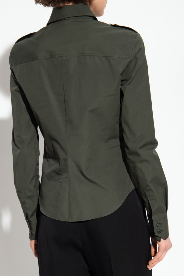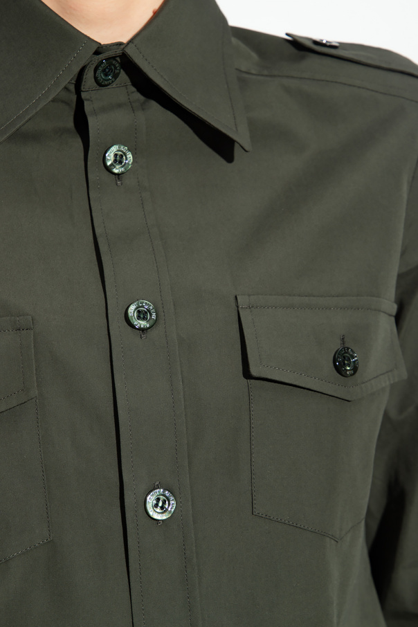 Green shirt from Saint Laurent. Made of cotton, this style fastens with buttons and features shoulder epaulettes, two flapped pockets with buttons on the chest and long sleeves with button cuffs.