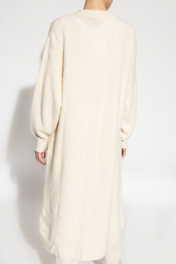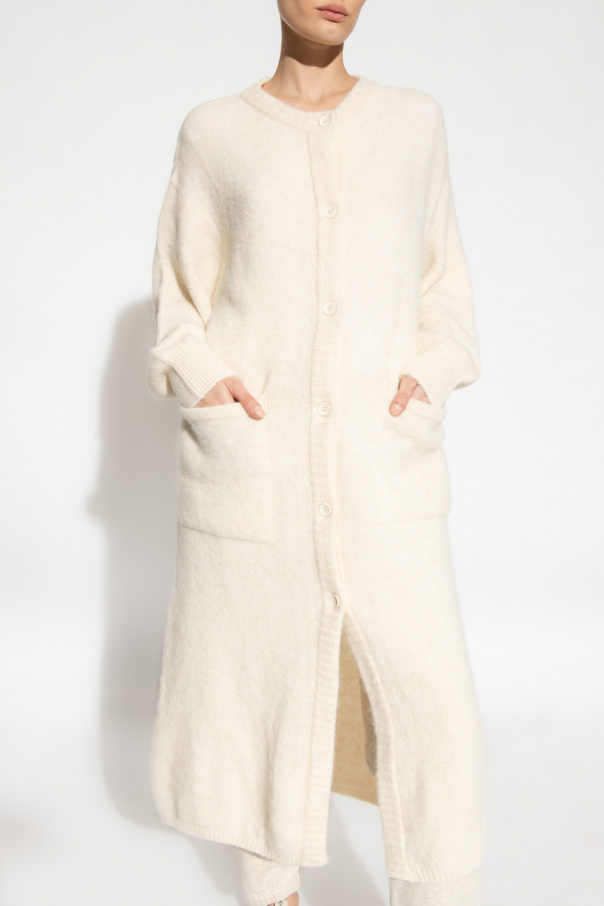 Cream loose-fitting cardigan from American Vintage. Crafted from an alpaca and wool blend, this garment is complete with buttons, two slip pockets and ribbed trims at the crew neck, hem and cuffs.