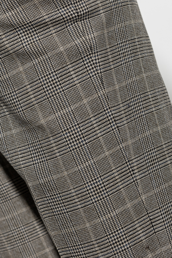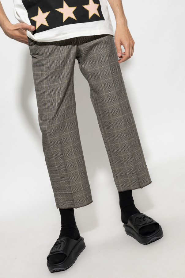 Beige, black and blue trousers from Gucci. Crafted from a wool and cotton blend, this design features a zip and button fastenings, check pattern, slightly tapered, pleat-front legs, two front pockets, two buttoned back pockets and buckle strap at the back.