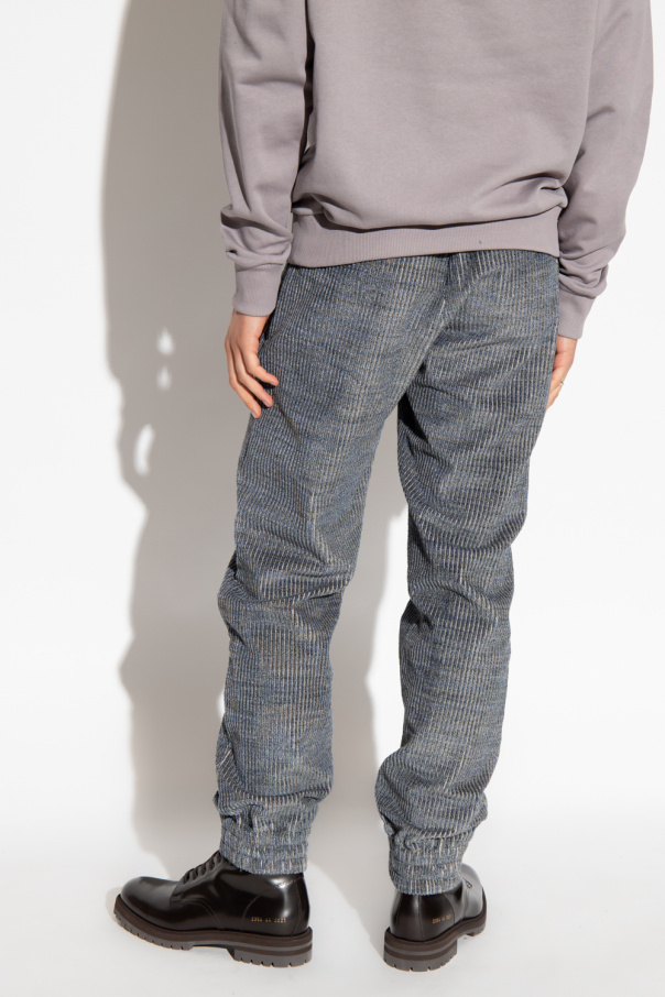 Grey and blue corduroy trousers from Emporio Armani. Crafted from a cotton and linen blend, this pair features a zip fly with hooks, two front slip pockets, two back button pockets and elasticated cuffs.