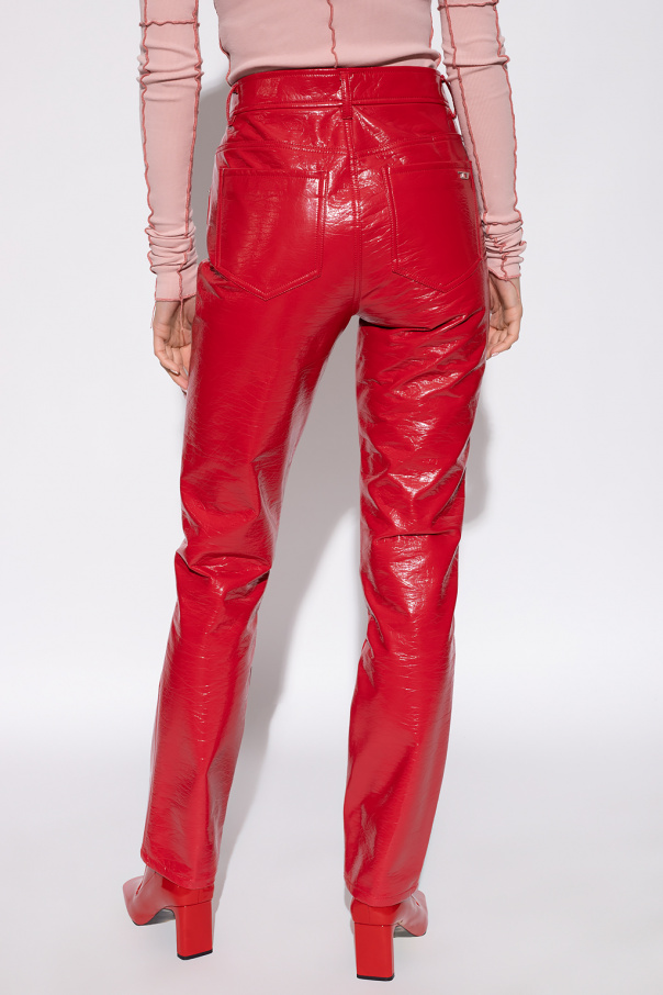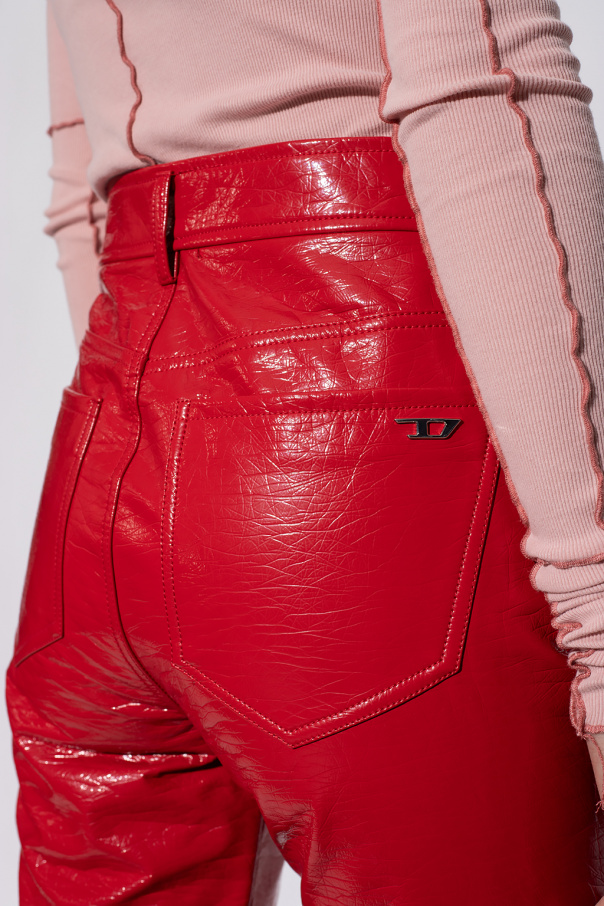 Red 'P-Arcy' trousers from Diesel. Crafted from varnished faux-leather, this pair features a zip fly with a button, four slip pockets, straight legs and a silver-tone logo appliqué on the back.