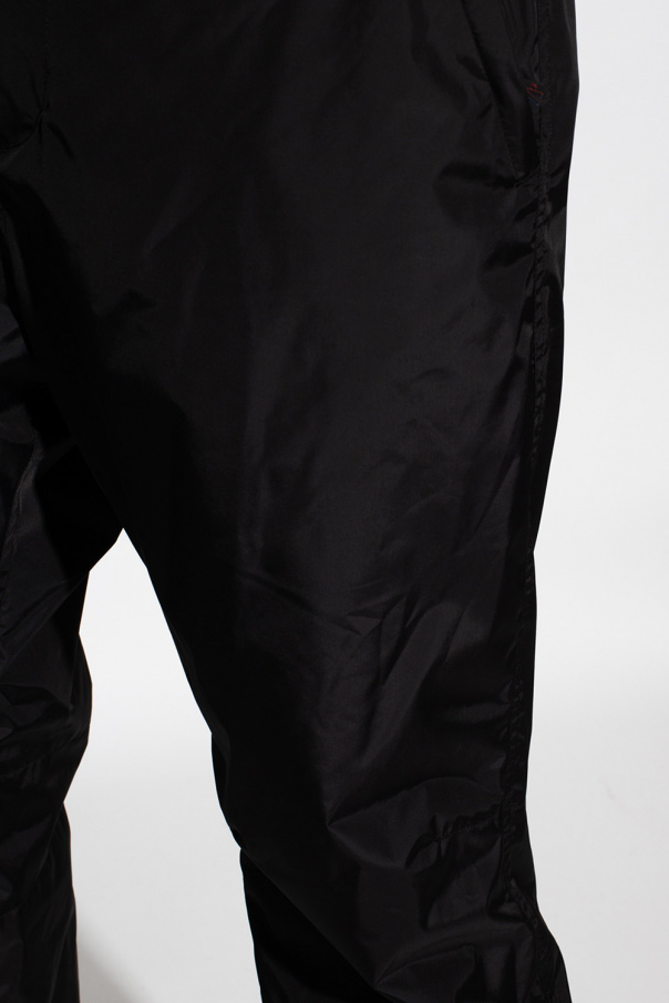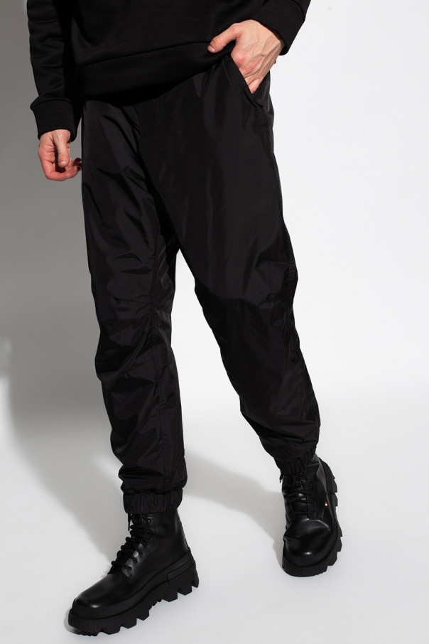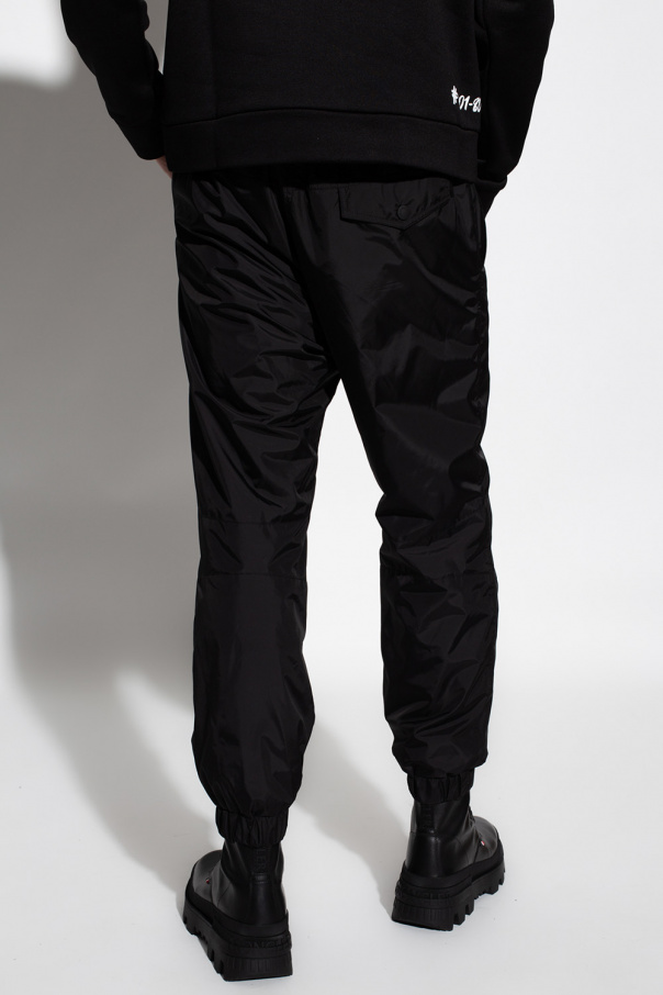 Black trousers from Moncler Grenoble. Offering wind- and water-resistant and thermal insulating properties, this pair features an elasticated waistband, a zip fly with a snap, two zipped pockets on the front, one flapped pocket with a snap closure on the back and elasticated trims on the cuffs.