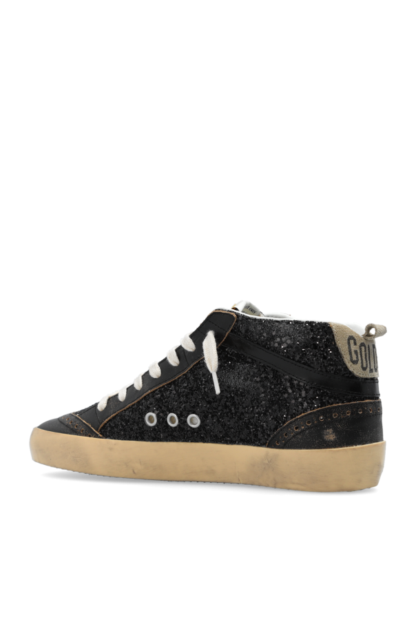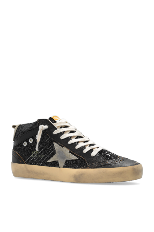Black ‘Mid Star’ sneakers from Golden Goose. Crafted from leather with a vintage effect and spruced up with black glitter, this lace-up model sits on a black and beige rubber sole and showcases a signature star-shaped patch, logo detailing, decorative perforations and a grey suede heel counter.