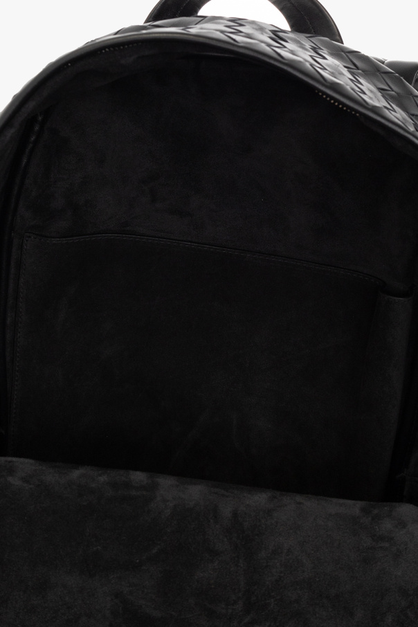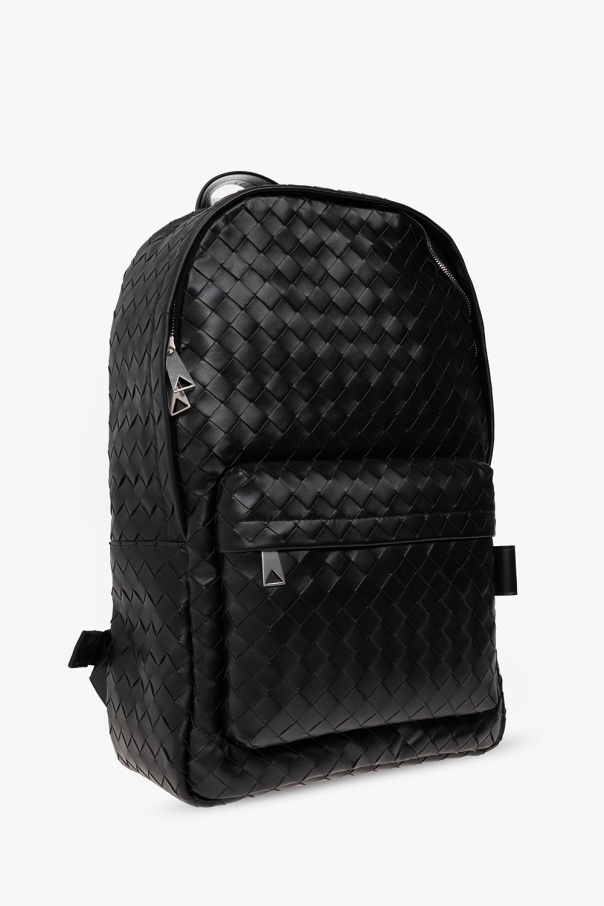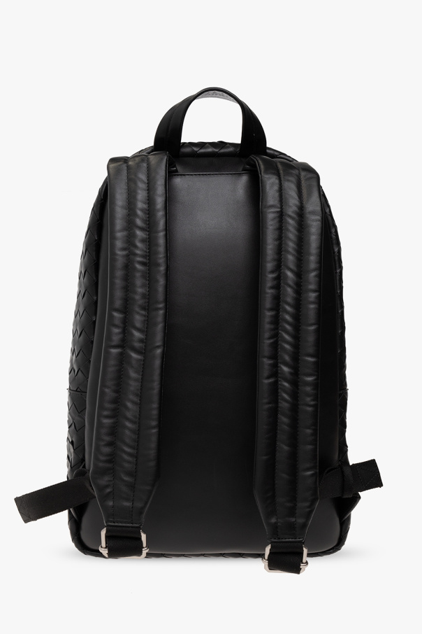 Black ‘Classic Intrecciato Medium’ backpack from Bottega Veneta. Crafted from calf leather, this design features a two-way zip fastening, a half-round top handle, a zip pocket on the front, adjustable shoulder straps, silver-tone metal hardware and one internal compartment with a slip pocket.