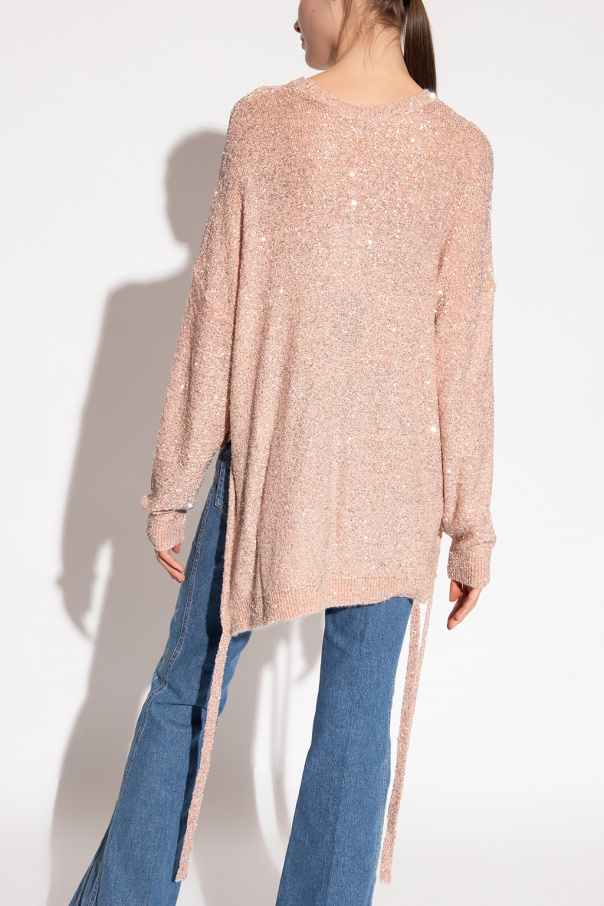 Blush pink loose-fitting sweater from Stella McCartney. This garment features silver-tone sequins, slits with drawstrings on the sides and ribbed trims at the crew neck, hem and cuffs.