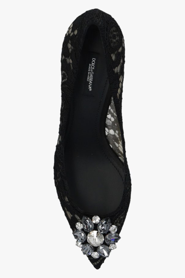 Black ‘Bellucci’ stiletto pumps from Dolce & Gabbana. Rendered in lace, this model sits on a cream leather sole and showcases a pointed toe silhouette with a crystal-embellished application on the front.