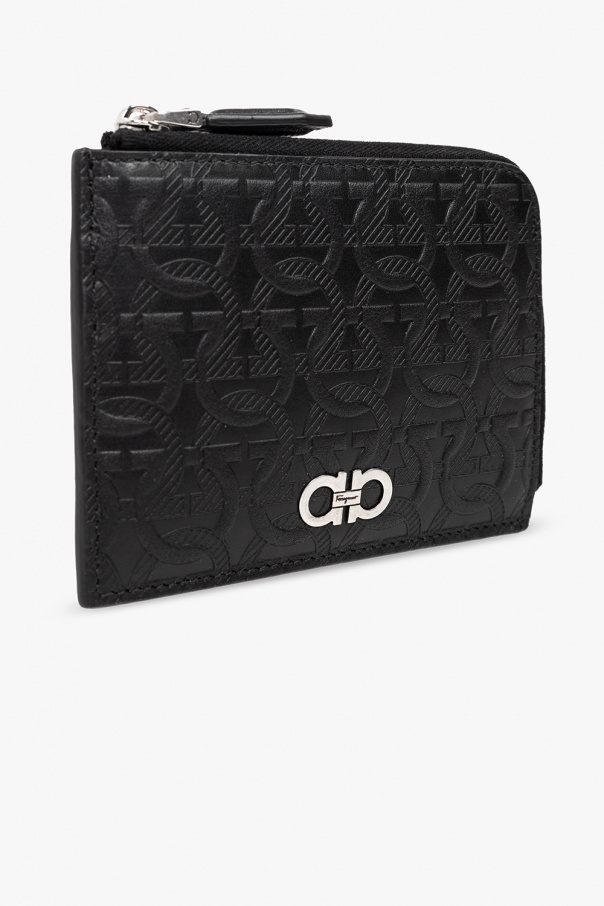 Black card case from Salvatore Ferragamo. Made from leather embossed with the brand\'s signature Gancini pattern, this design features a zip fastening, a silver-tone logo plaque on the front and six card slots inside.
