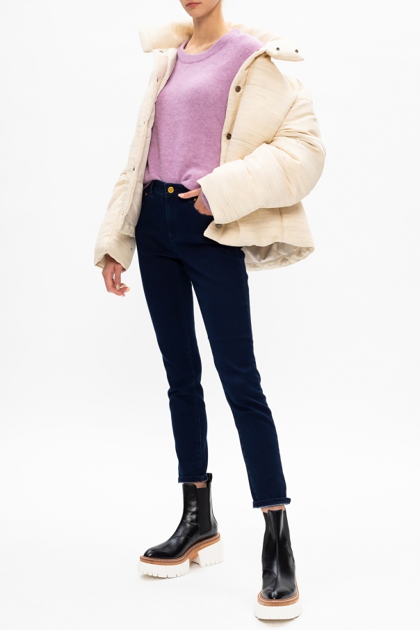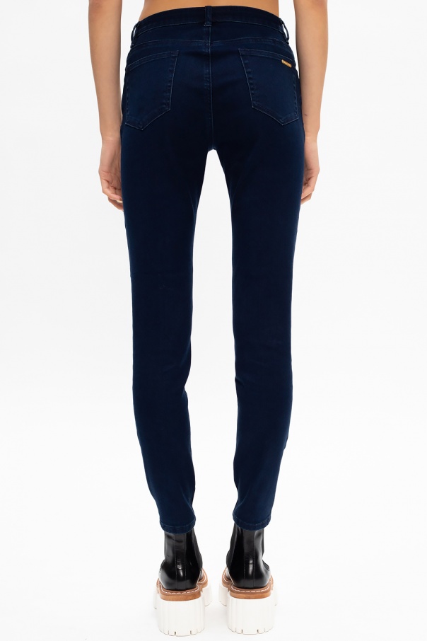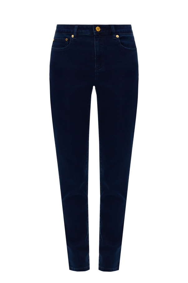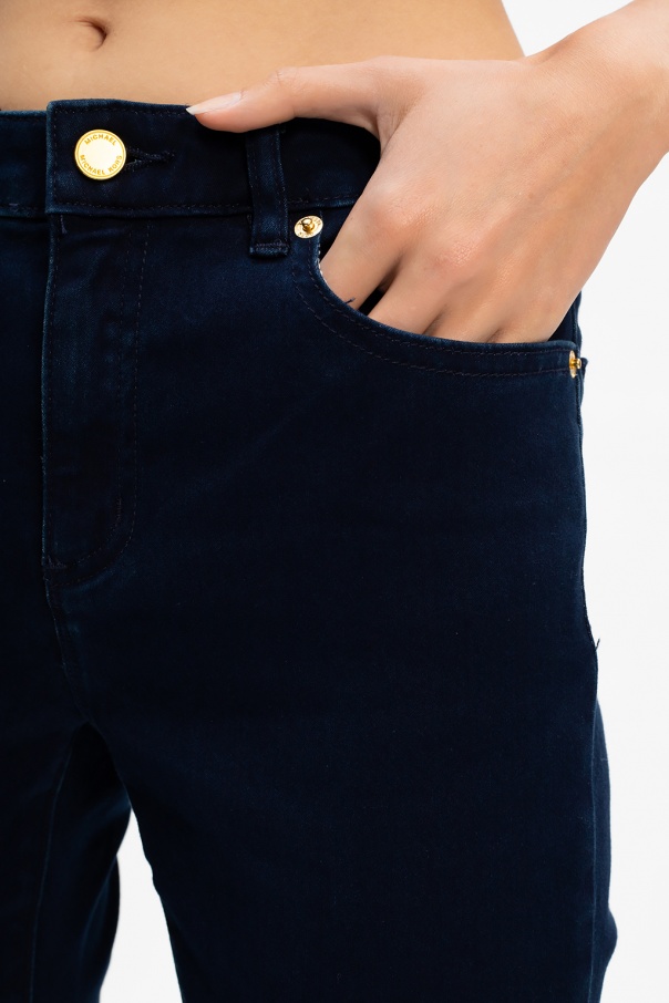 Navy jeans from Michael Kors. Fastened with a button and zip fly, this tapered leg design features a gold-tone logo detail, two front pockets and two back pockets.