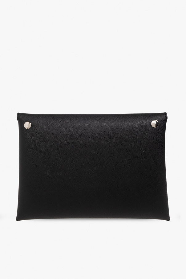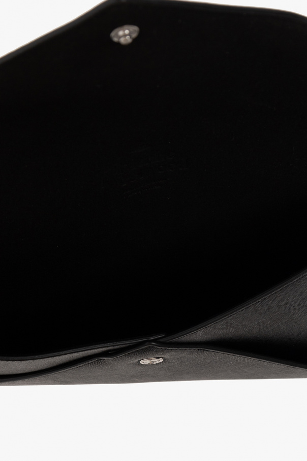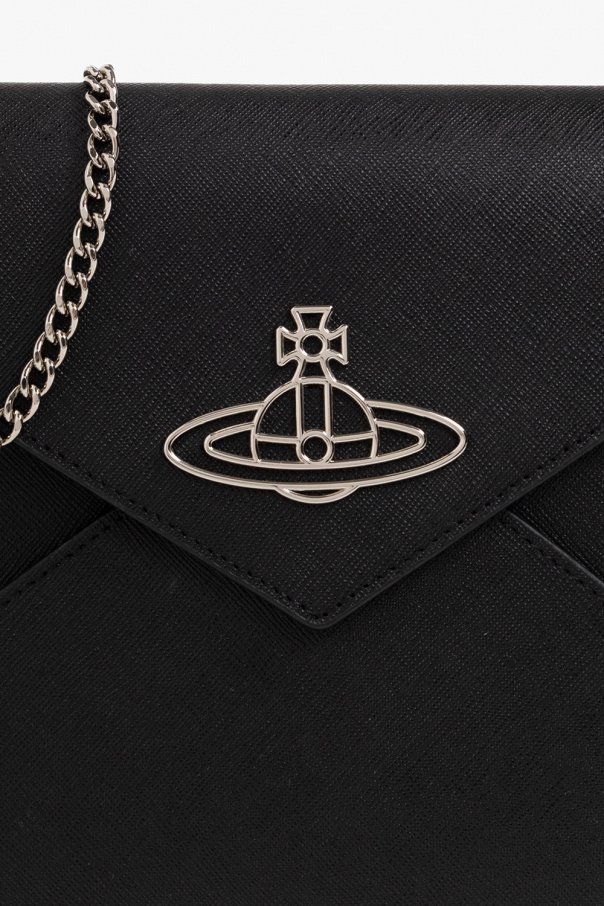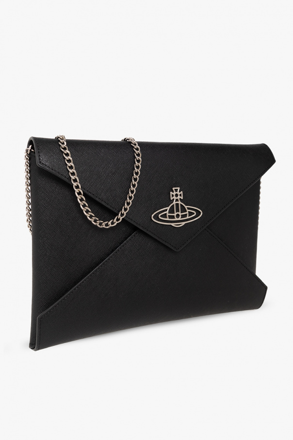 Black ‘Orb Envelope’ clutch from Vivienne Westwood. Made of leather, this model features a snap closure, metal logo appliqué, shoulder chain, one internal compartment and silver-tone metal hardware.