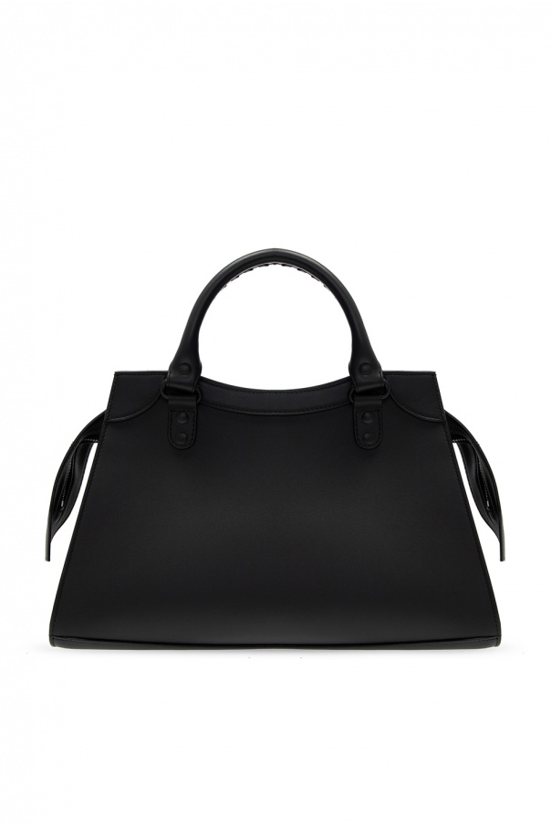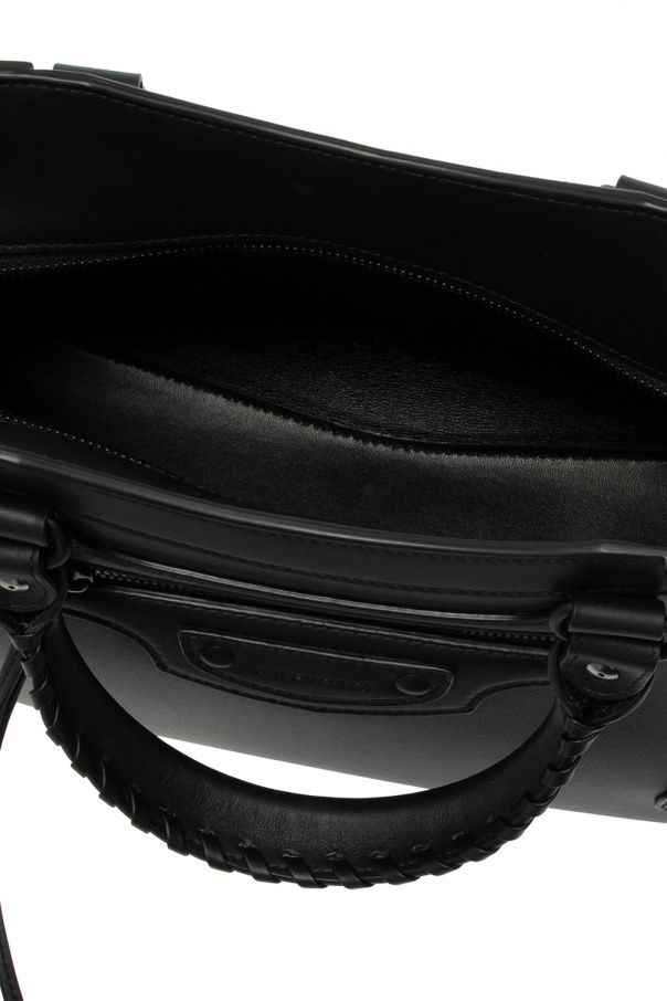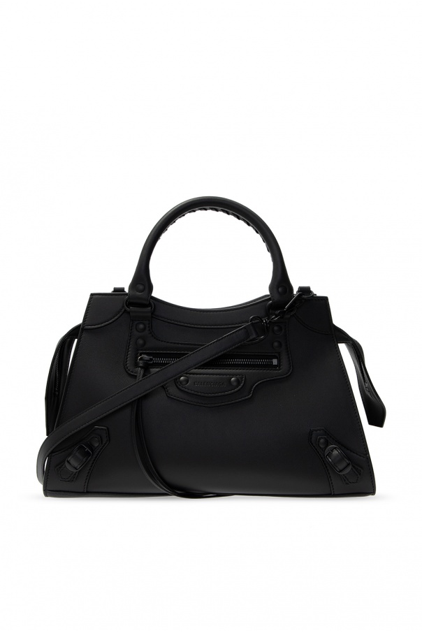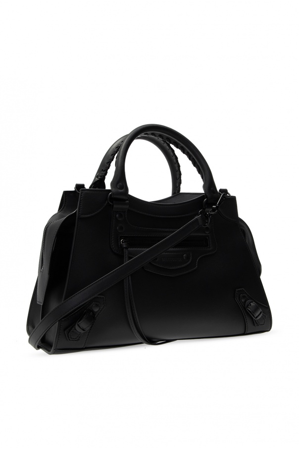 Black ‘Neo Classic’ shoulder bag from Balenciaga. Size small. Made of calf leather, this design secures with a two-way zip and showcases decorative appliqués and stitching details, a zip pocket and an embossed logo on the front, two half-round handles, a detachable and adjustable shoulder strap, black metal hardware and one internal compartment with a slip pocket.