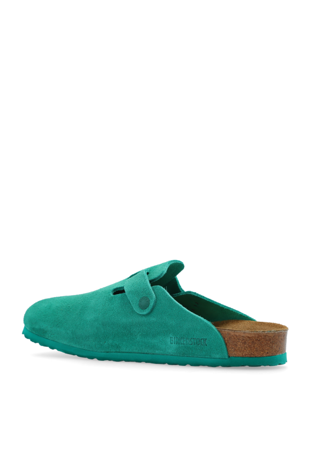 Green ‘Boston’ slides from Birkenstock. Made of suede, this pair features a standard width upper, adjustable buckle strap, embossed logo to the side, anatomically shaped cork-latex footbed and green EVA foam sole.