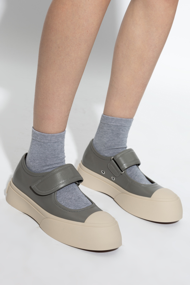 Introducing the illustrious Mary Jane Shoes from the exclusive collection by Marni, a brand renowned for its eclectic flair and meticulous craftsmanship. These exquisite shoes, in a dominant gray hue with a contrasting light sole, seamlessly blend classic elegance with contemporary design. Crafted from luxurious calf leather, both the outer and inner layers exude superior quality and durability. The classic Mary Jane silhouette, distinguished by its strap closure across the foot, is enhanced with a thick, light rubber sole featuring a rounded toe, adding a modern twist to a timeless style. Adorned with the iconic Marni logo on the heel, these shoes epitomize exclusivity and sophistication. Ideal for both casual and elegant ensembles, they offer unparalleled comfort without compromising on style. Why choose this product? Exquisite blend of classic and modern design. High-quality calf leather for durability. Iconic Marni branding for a touch of exclusivity. Versatile style suitable for various occasions.