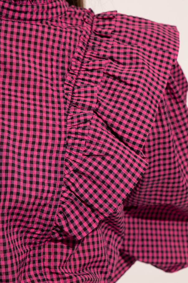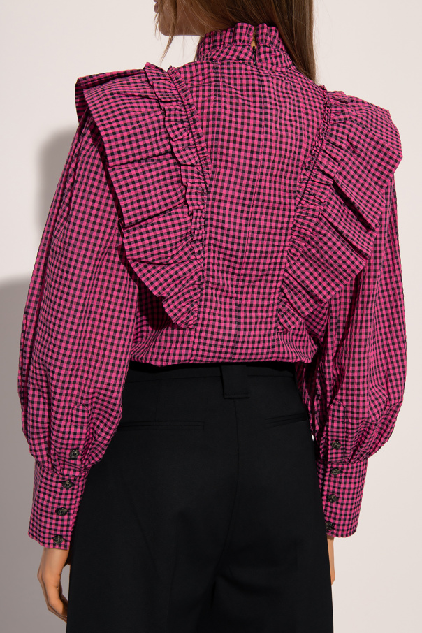 Black and pink shirt with a standing collar from Ganni. Embellished with a check pattern and ruffle detailing, this style features a hidden zip fastening at the back and long blouson sleeves with button cuffs.