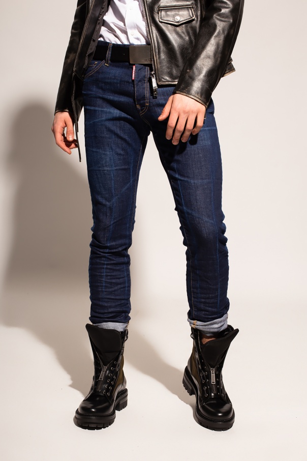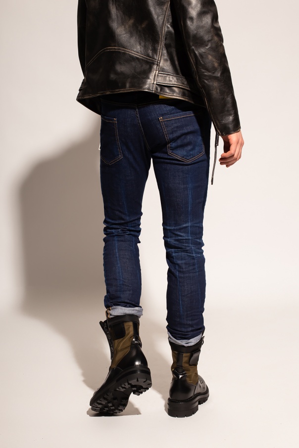 Blue ‘Cool Guy Jean’ jeans from Dsquared2. Crafted from stonewashed cotton denim, this five-pocket design falls down with straight legs and features button fastenings, yellow stitching details and a yellow patch with an embossed logo.