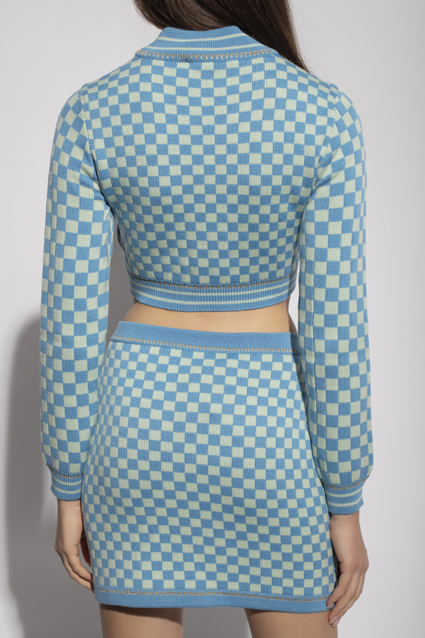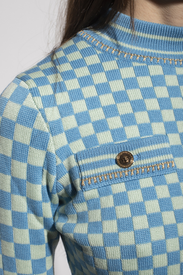 Blue and light green sweater with a stand-up collar from Versace. Made of wool with a cropped silhouette, this style showcases an all-over check pattern, two elastic tapes with a distinctive button, gold-tone trims and elasticized edges.