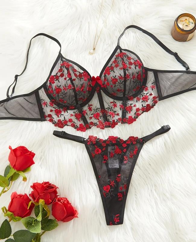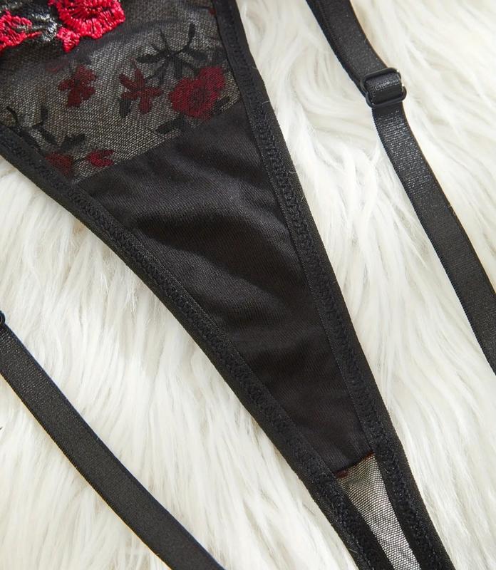 Матеріал:Поліестер ,Модель трусиків:Стринги ,Чашка:Без Push-up ,Стиль:Романтичний ,Декор:Вишивка ,Вид комплекту:З бюстгальтером ,Принт:Квітковий , - Shipping