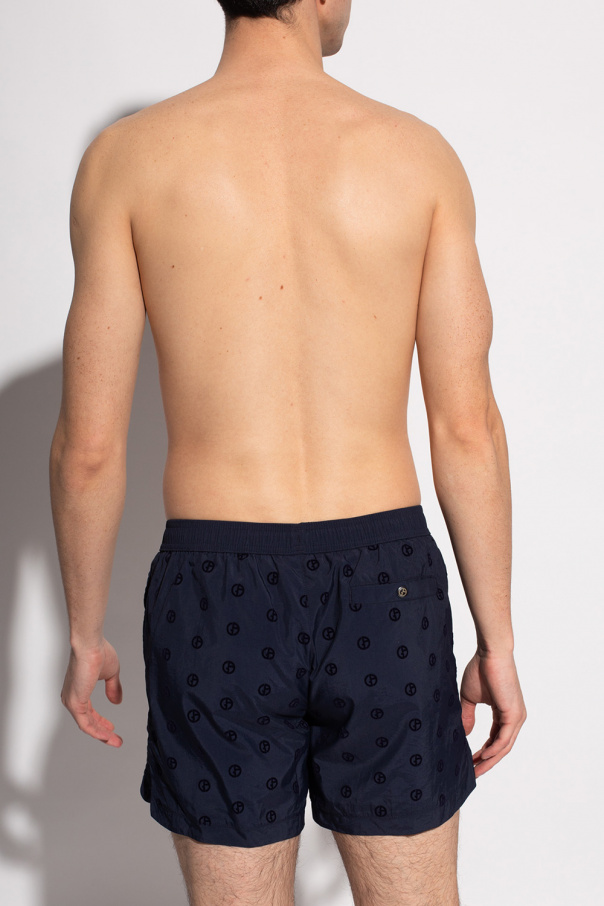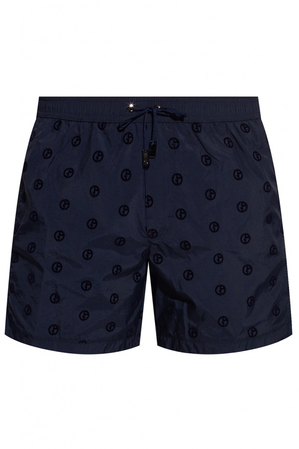 Navy swim shorts from Giorgio Armani. Fastened with drawstrings, this design features a velour logo pattern in white, two front pockets and a snap-fastened back pocket. Comes with a branded case.