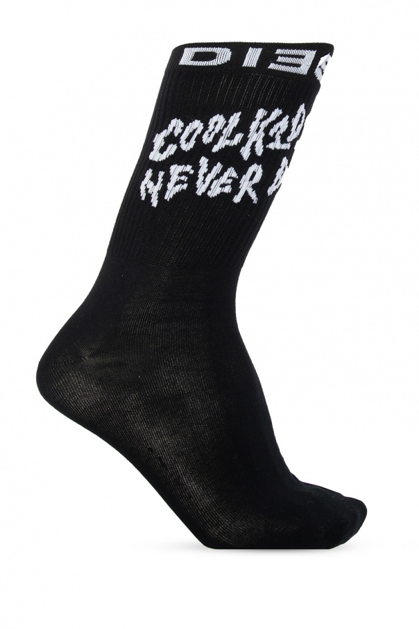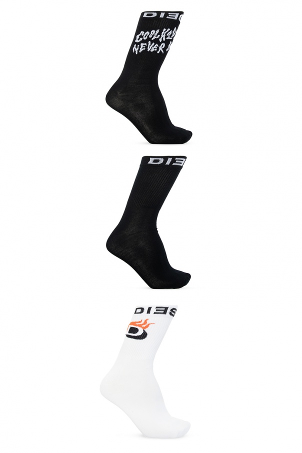 Black and white socks three-pack from Diesel. Crafted in a stretch cotton blend with ribbed detailing, they feature elastic trims and an embroidered logo pattern.