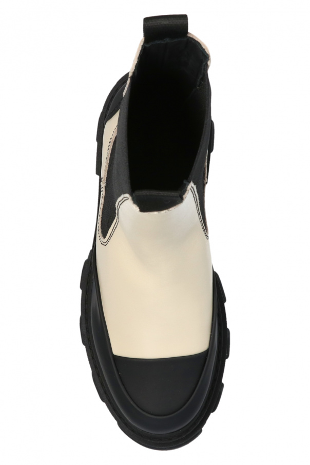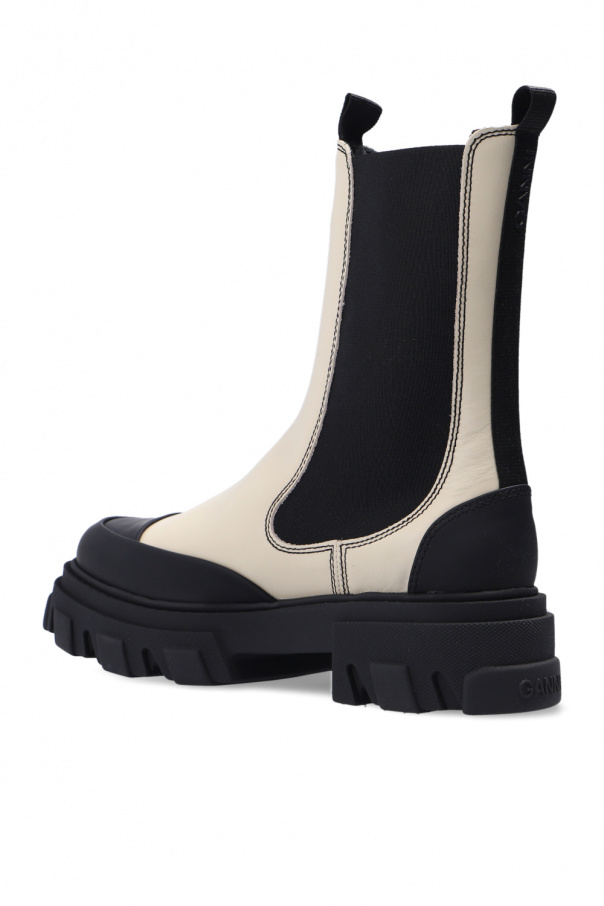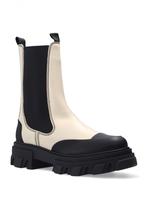 Cream and black Chelsea boots from Ganni. Crafted from leather, this model sits on a black rubber sole and features elastic panels on the sides.