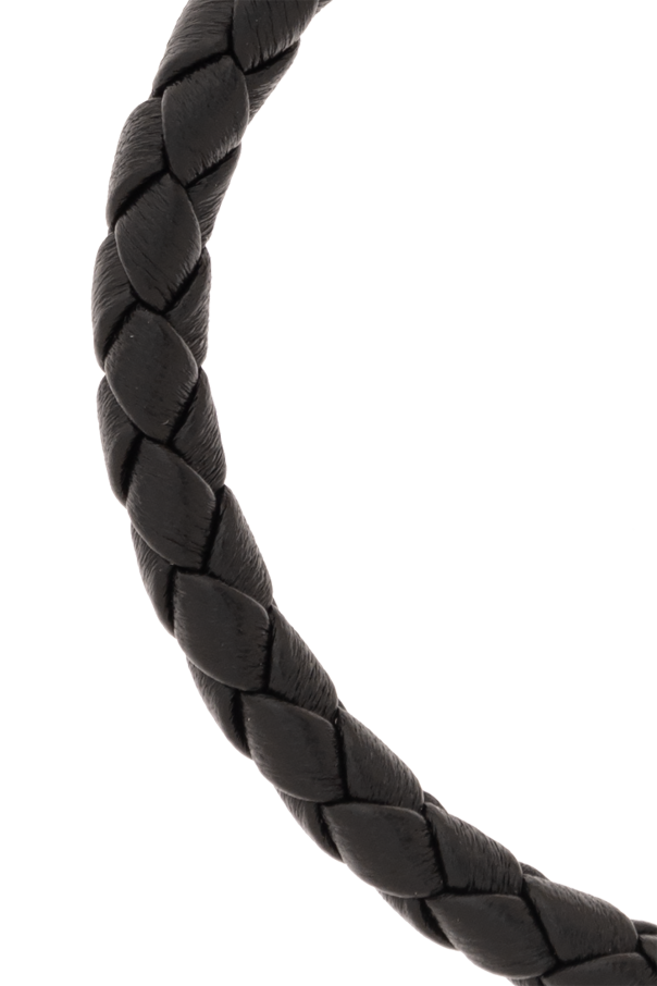 Black woven bracelet with a clasp closure and a Medusa head detail from Versace. Made of leather.