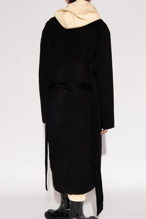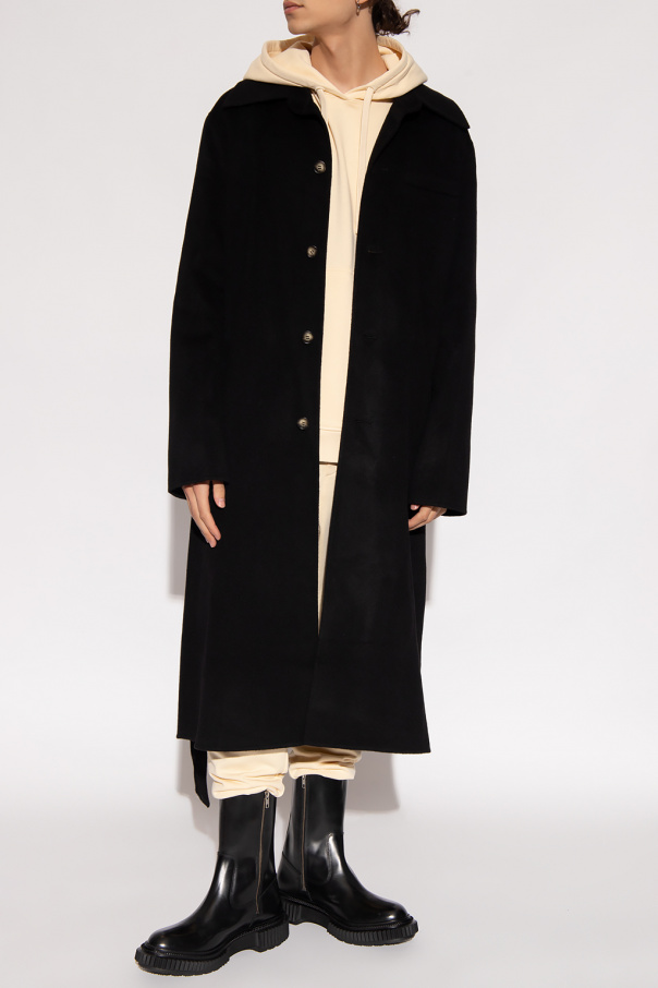 Black ‘Joren’ coat from Nanushka. Crafted from a wool and silk blend, this design features buttons, removable tie belt, three slip pockets, long sleeves with single rear vent.