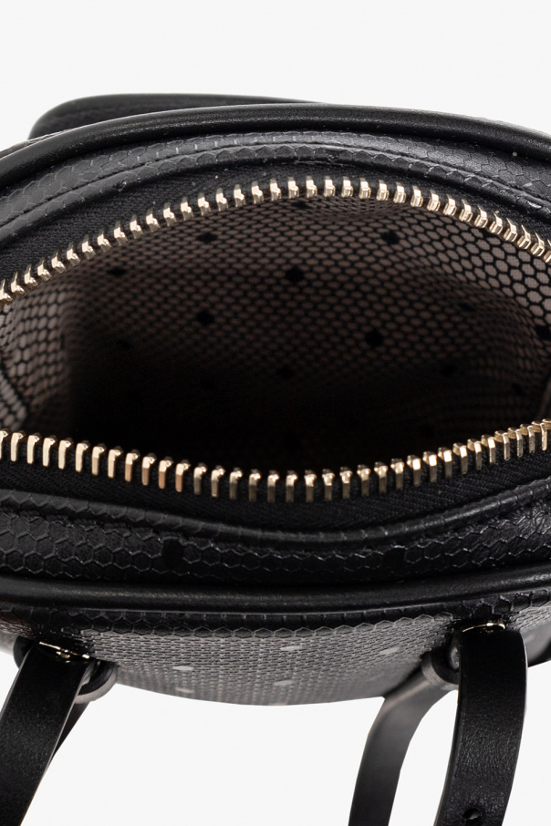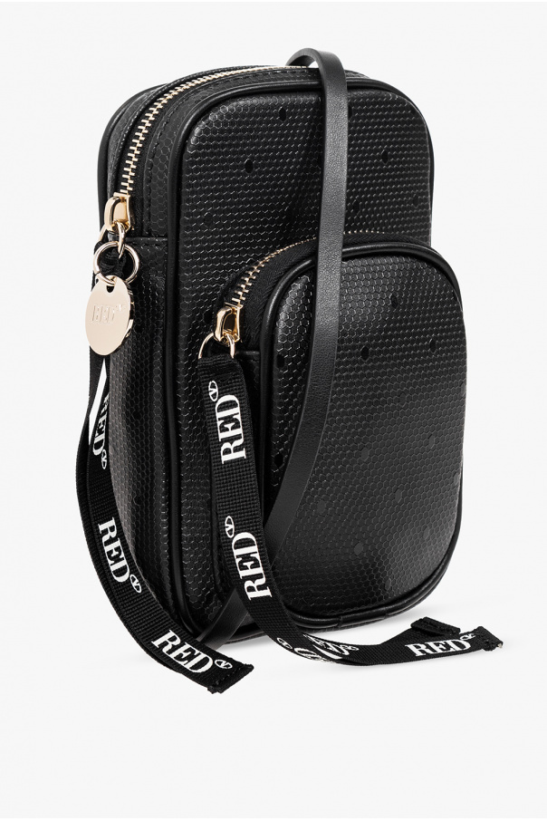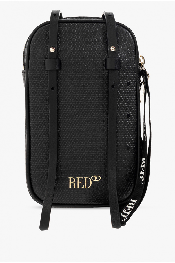 Black phone pouch from Red Valentino. Made of calf leather, this model features a zip fastening, gold-tone logo print, adjustable shoulder strap, front zip pocket, one internal compartment and gold-tone metal hardware.