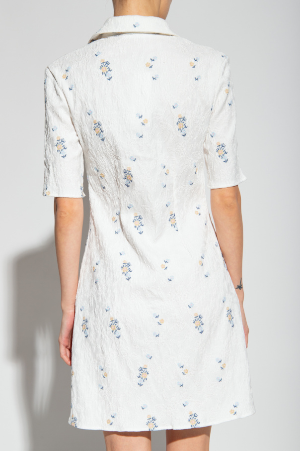 White ‘Mariah’ dress from Samsoe Samsoe. Made of a blend of recycled materials, this design features button fastenings, jacquard floral print and short sleeves.