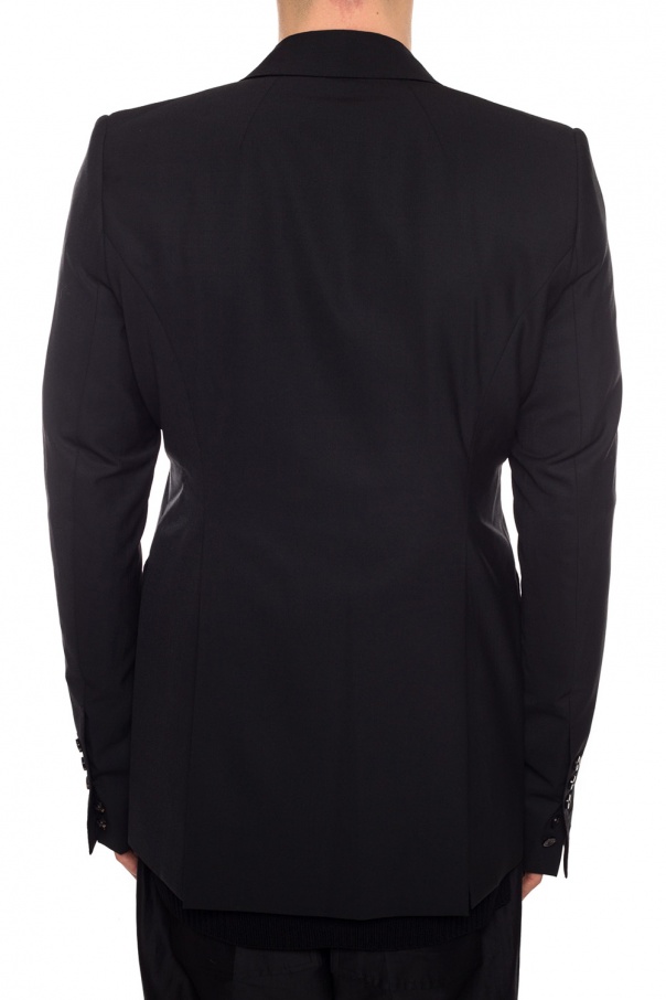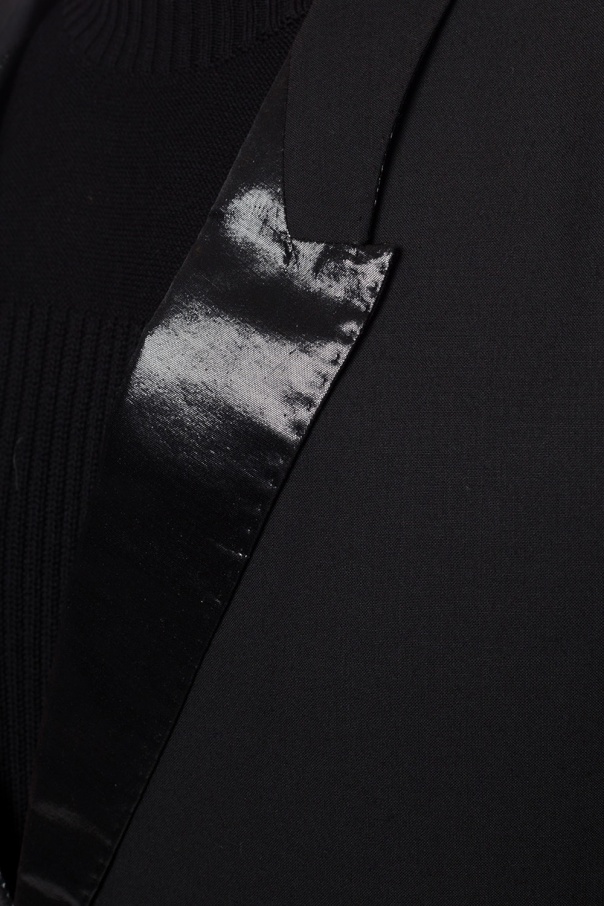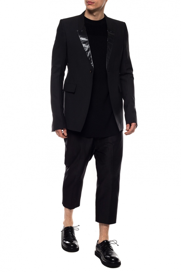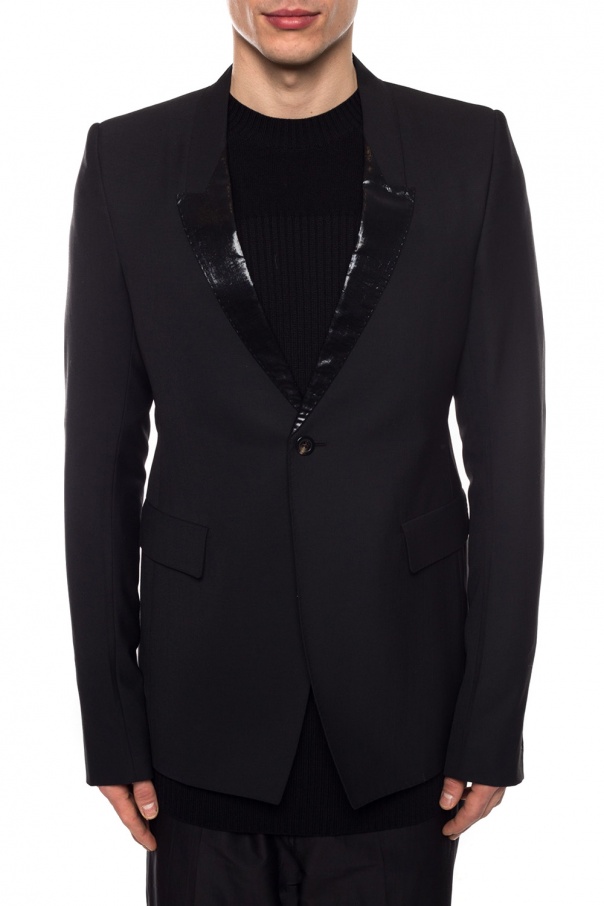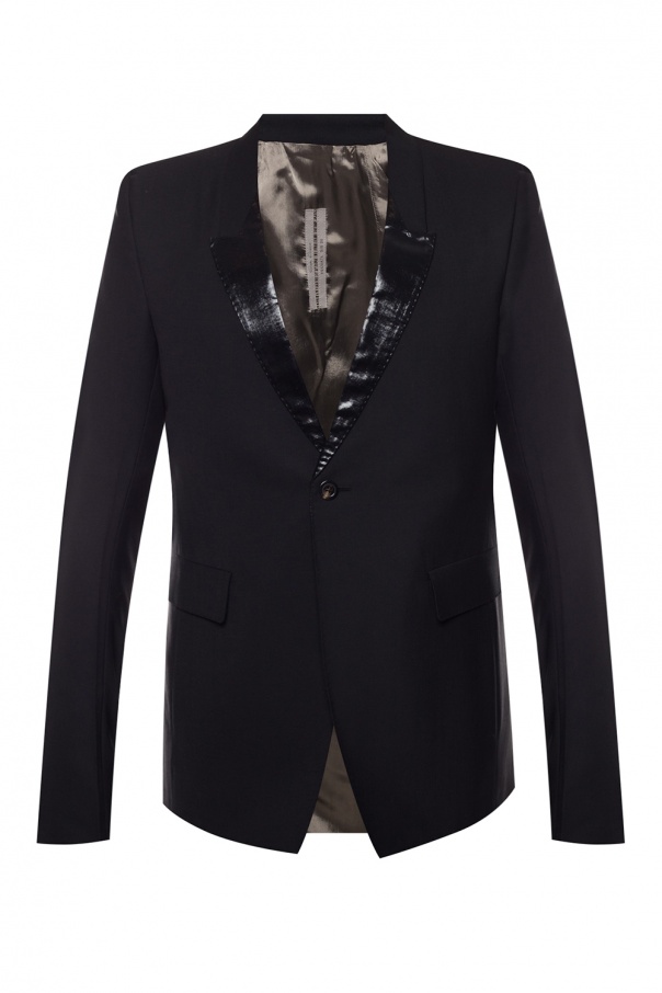 Black blazer with iridescent lapels from Rick Owens. Single button fastening. 2 flaps on the front. Double split vent on the back. Beige and grey lining.