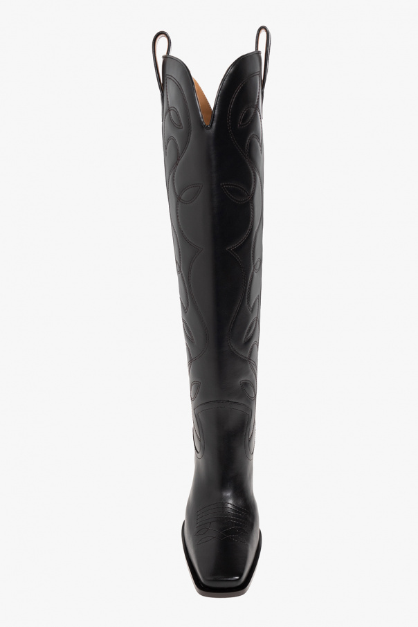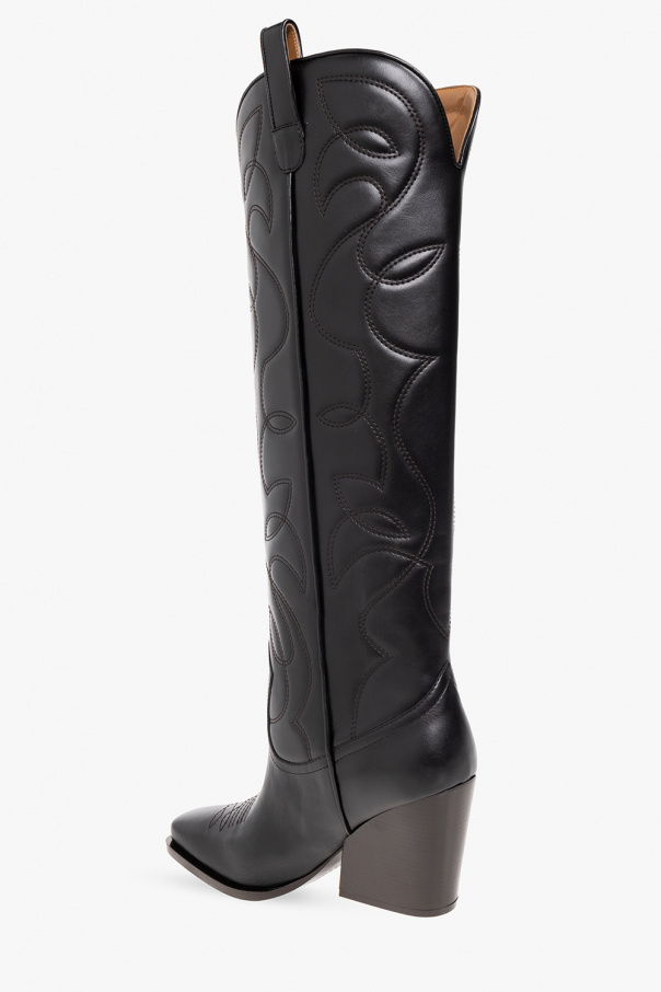 Black ‘Cowboy’ heeled boots from Stella McCartney. Crafted from faux leather, this model features a square toe, decorative stitching details and a black rubber sole.