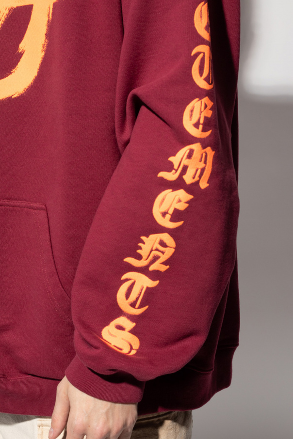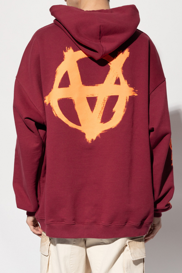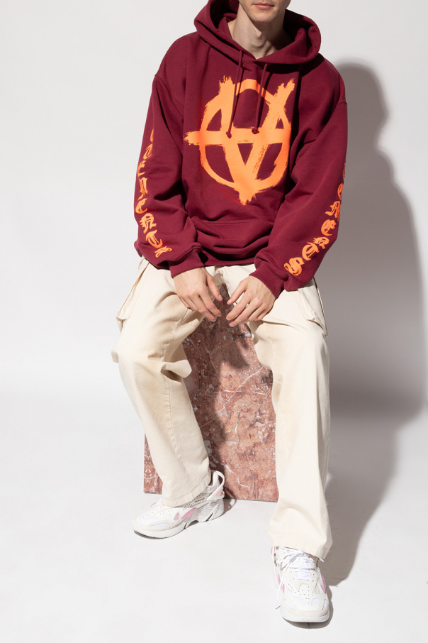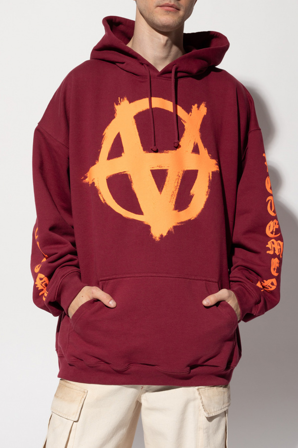 Maroon hoodie from VETEMENTS. Crafted from cotton, this garment features a printed pattern in orange, drawstring hood, two slip pockets and ribbed trims at the hem and cuffs.