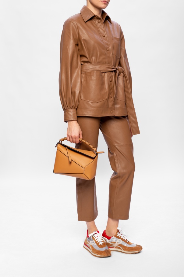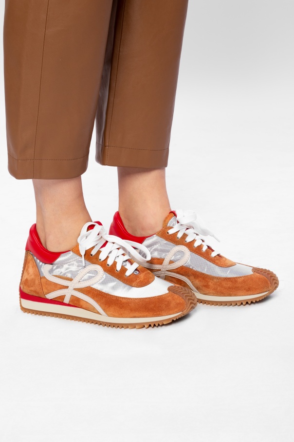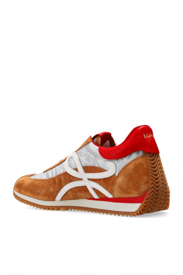 Brown, grey and red sneakers from Loewe. Boasting a monogram patch and gold-tone logo print, this lace-up pair sits on an orange rubber sole.