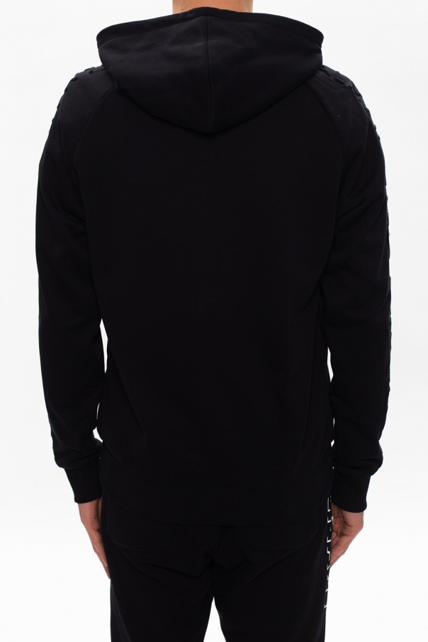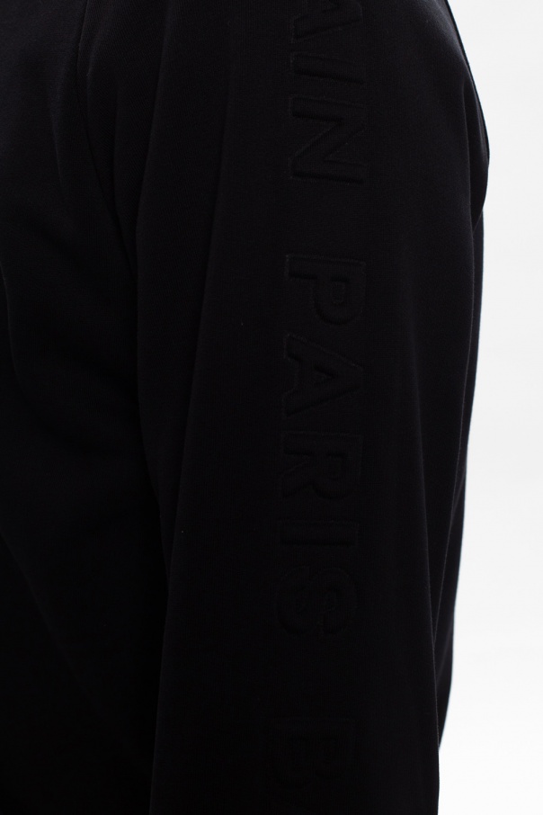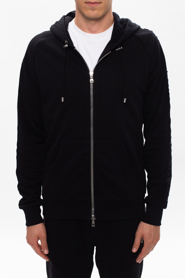 Black sweatshirt with a drawstring hood from Balmain. Made of cotton. Fastened via zip. Embellished with black tactile logo. Features two slip pockets and a ribbed bottom hem and cuffs.
