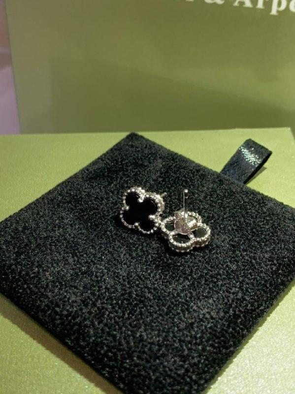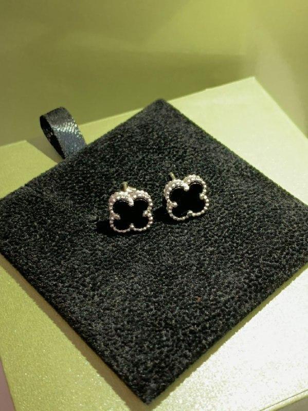 Серьги клевер маленький стиль Ван клиф серебро, черные эмаль под оникс