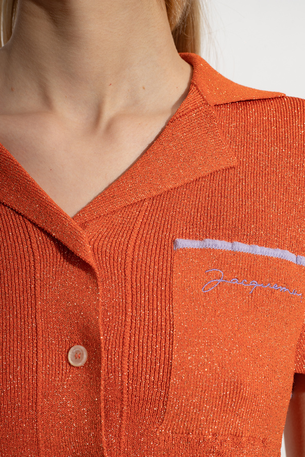 Orange ‘Brilho’ cropped shirt from Jacquemus. Made of ribbed knit fabric inlaid with gold-tone lurex threads, this garment is complete with buttons, a logo-embroidered front pocket, collar, short sleeves and decorative trimming in purple.
