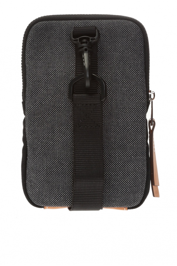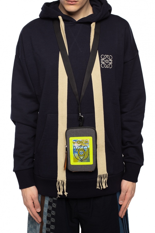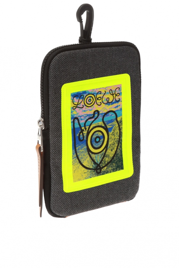 Dark grey phone case from Loewe, ‘Eye/Loewe/Nature’ collection. Trimmed with calf leather. Zip fastening. Decorated with a colorful logo patch. Detachable neck strap. One compartment, slip pocket and 3 card slots inside.