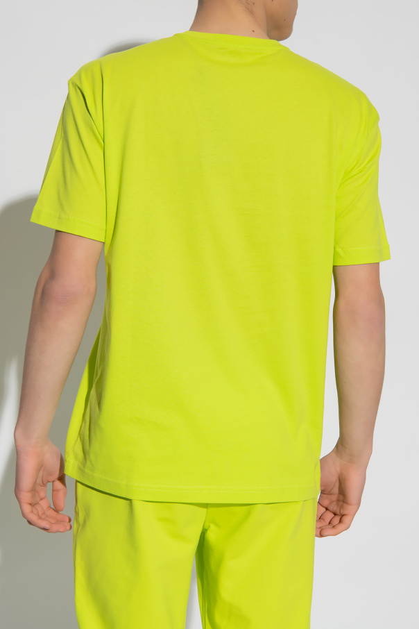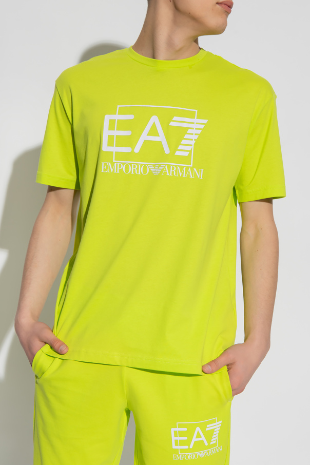 Neon-hued crewneck T-shirt from EA7 Emporio Armani. Made of cotton, this style features a white logo print, short sleeves and ribbing on the collar.